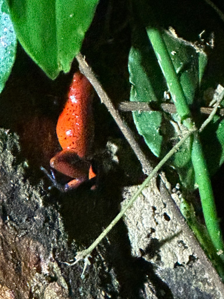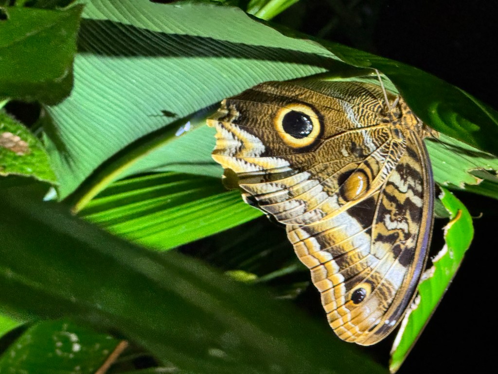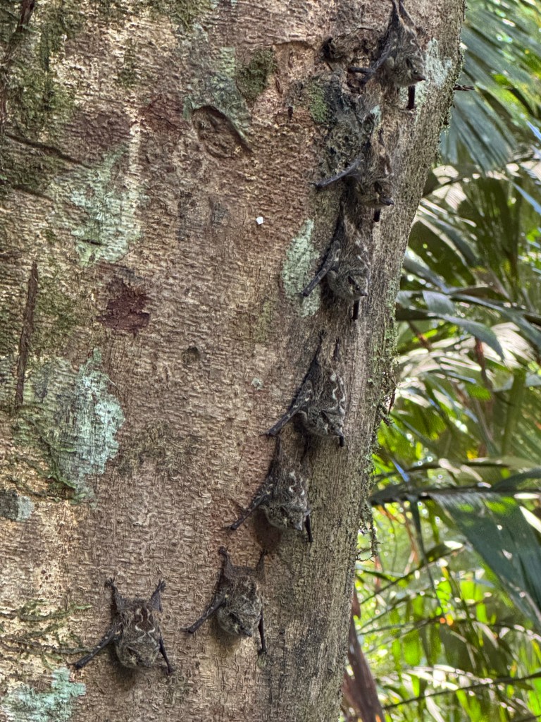 Lizard colloquially known as Jesus Christ Lizard as it can run on water, up to 5mStrawberry (poisonous) frog and owl butterfly seen on our night walkSloth and spider monkey seen from the waterSleeping batsWell camouflaged caiman and river turtle. We were outside the sea turtle season.
