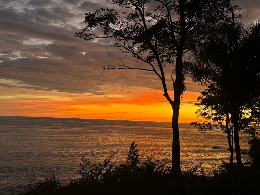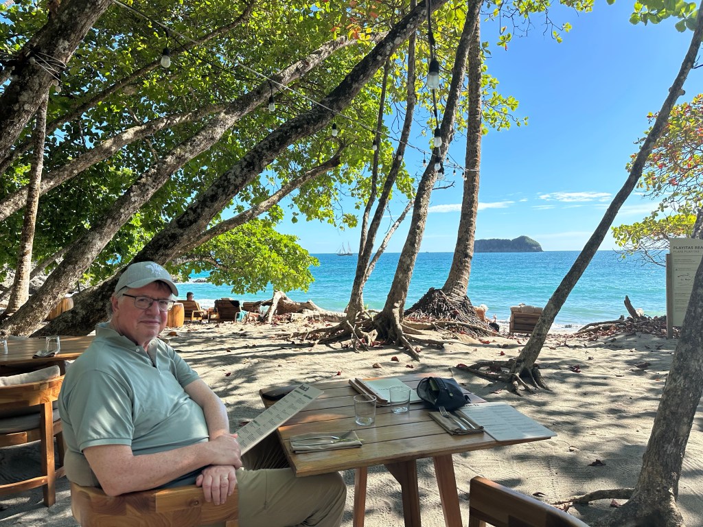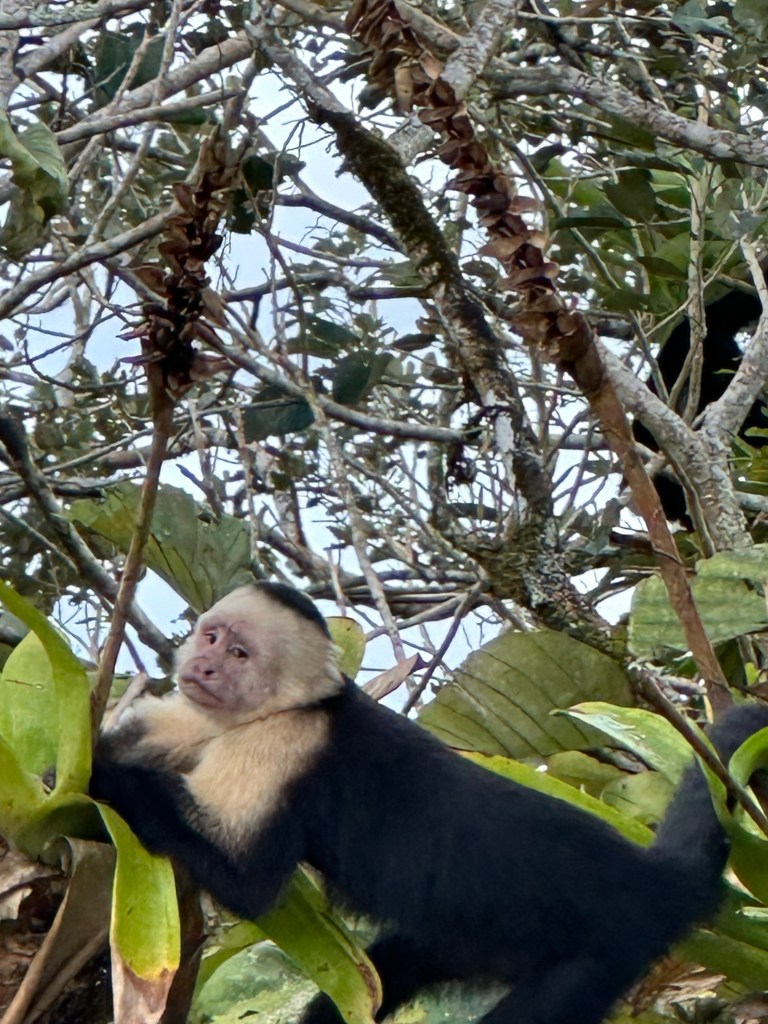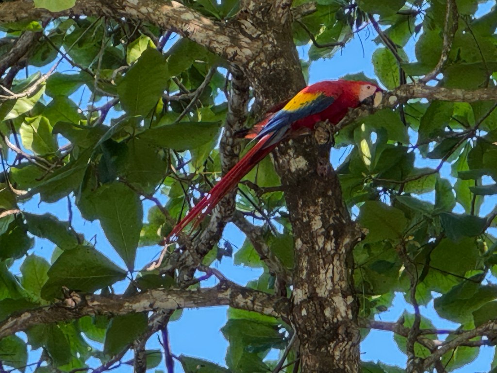 Seen from a bridge on our journey Lunch on our arrivalManuel Antonio National ParkThe cafe in the National Park – it’s in a cage for the humans !White faced monkey,The park comprises ocean, beach, mangroves and forest, creating numerous habitats including for creatures such as crabsRoble de Sabana, a variety of oak tree, which has a brief flowering season at this time of yearBamboo is not endemic in Costa Rica but was planted by farmers at the time of developing plantations. It flowers after 40 years, coinciding with our visit, at which point it then dies. While not Tim’s idea of fun, Sarah ventured onto the ocean by kayak with a Canadian couple and a guide. The destination was a reef where the snorkelling was excellent Pre breakfast walk on the beach by our hotel on our final morning Our hotel is the building on the cliff at the end of the beach, the National Park is at the other endOn our walk we saw a flock of scarlet macaws