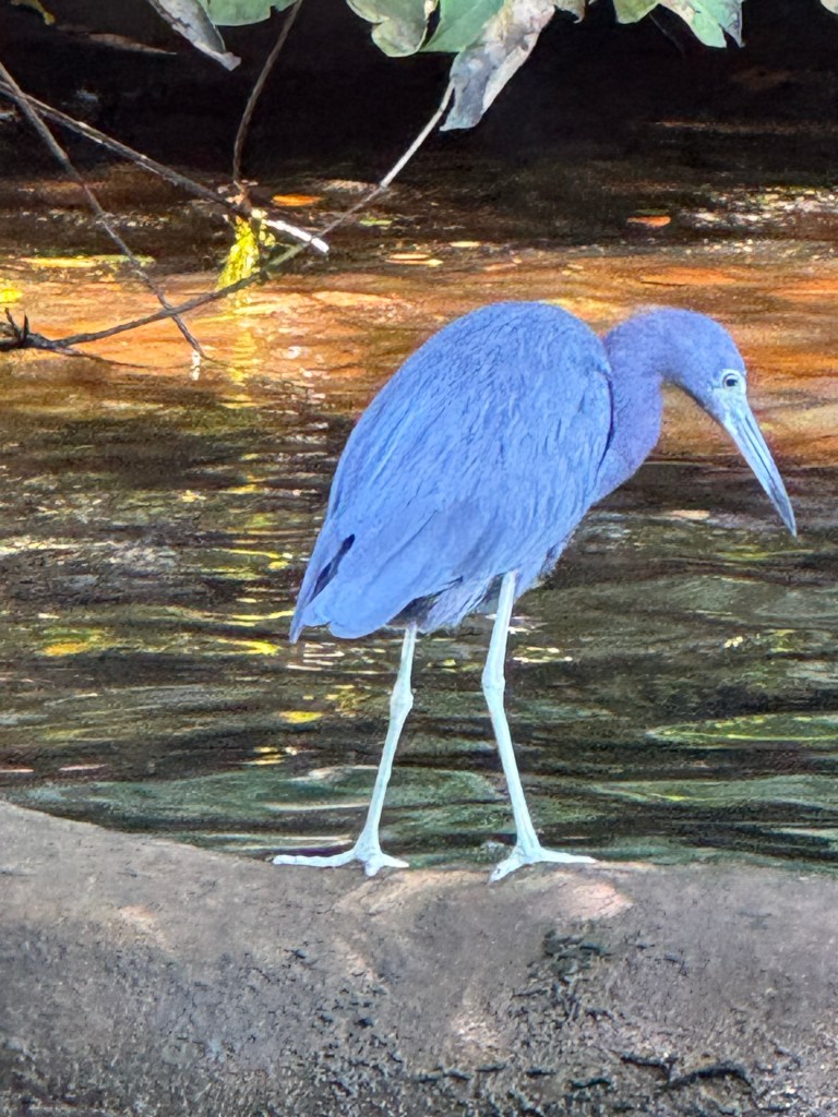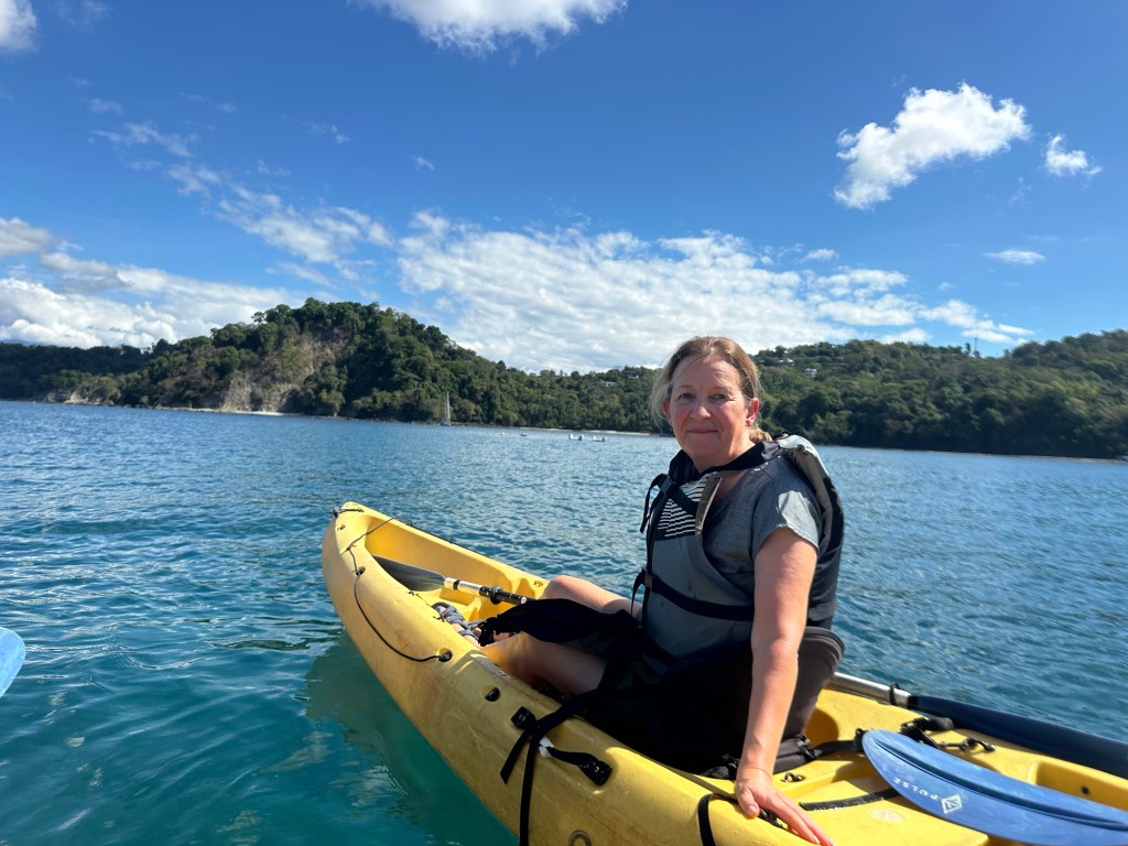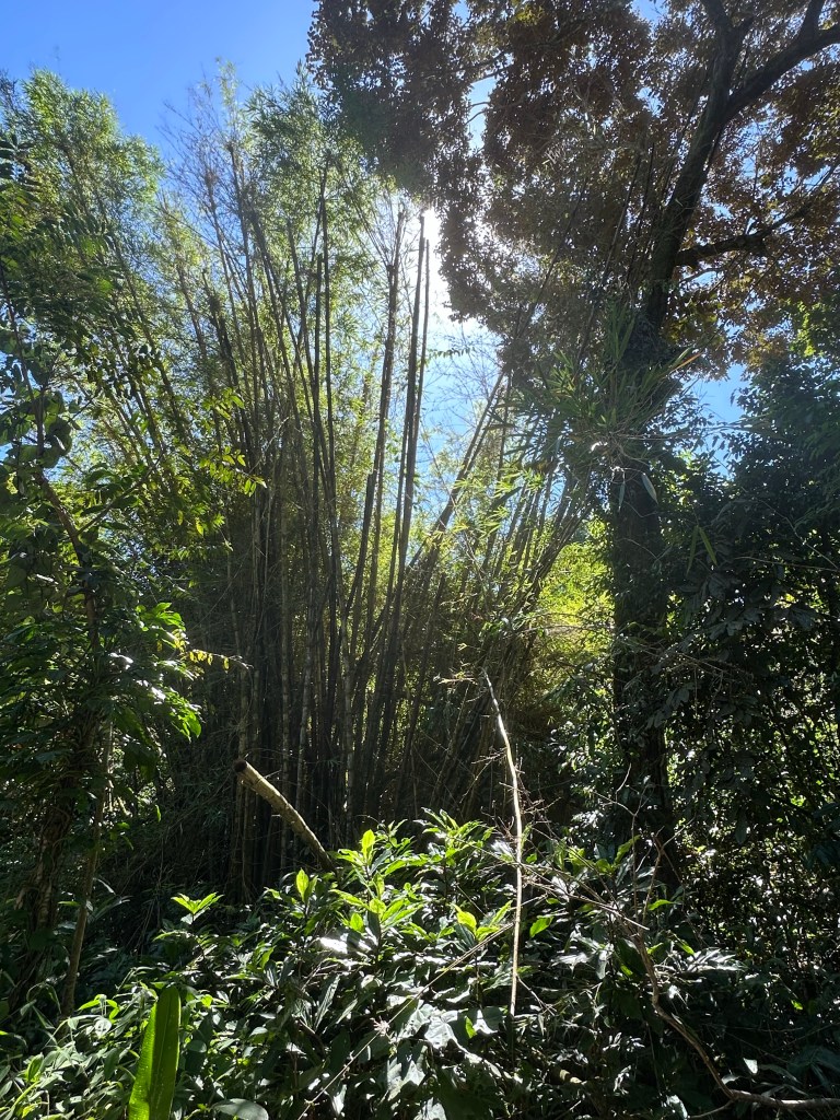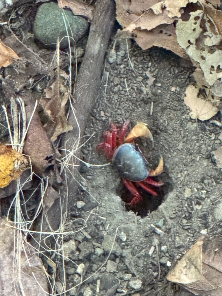 Seen from a bridge on our journey Lunch on our arrivalManuel Antonio National ParkThe cafe in the National Park – it’s in a cage for the humans !White faced monkey,The park comprises ocean, beach, mangroves and forest, creating numerous habitats including for creatures such as crabsRoble de Sabana, a variety of oak tree, which has a brief flowering season at this time of yearBamboo is not endemic in Costa Rica but was planted by farmers at the time of developing plantations. It flowers after 40 years, coinciding with our visit, at which point it then dies. While not Tim’s idea of fun, Sarah ventured onto the ocean by kayak with a Canadian couple and a guide. The destination was a reef where the snorkelling was excellent Pre breakfast walk on the beach by our hotel on our final morning Our hotel is the building on the cliff at the end of the beach, the National Park is at the other endOn our walk we saw a flock of scarlet macaws