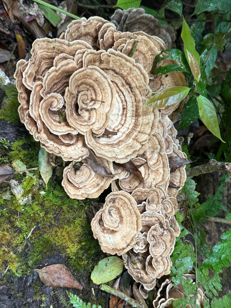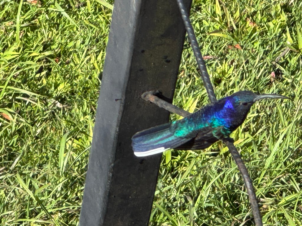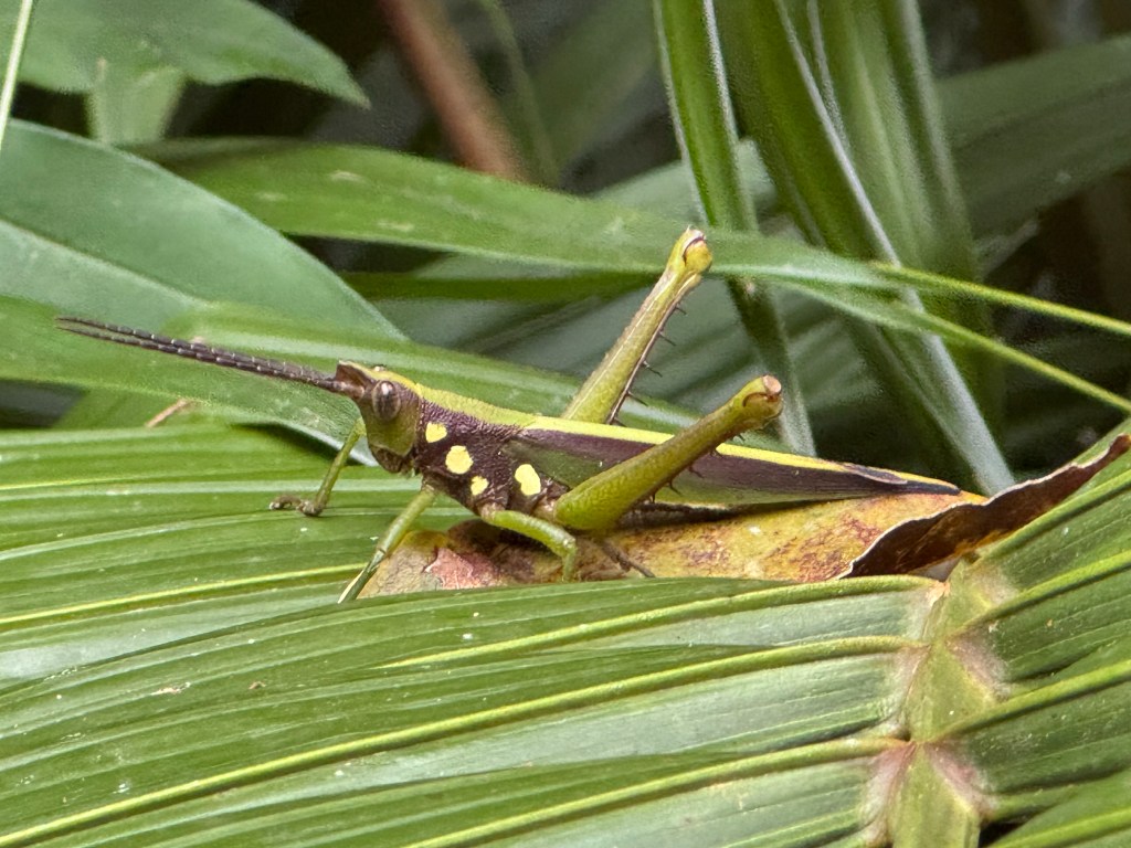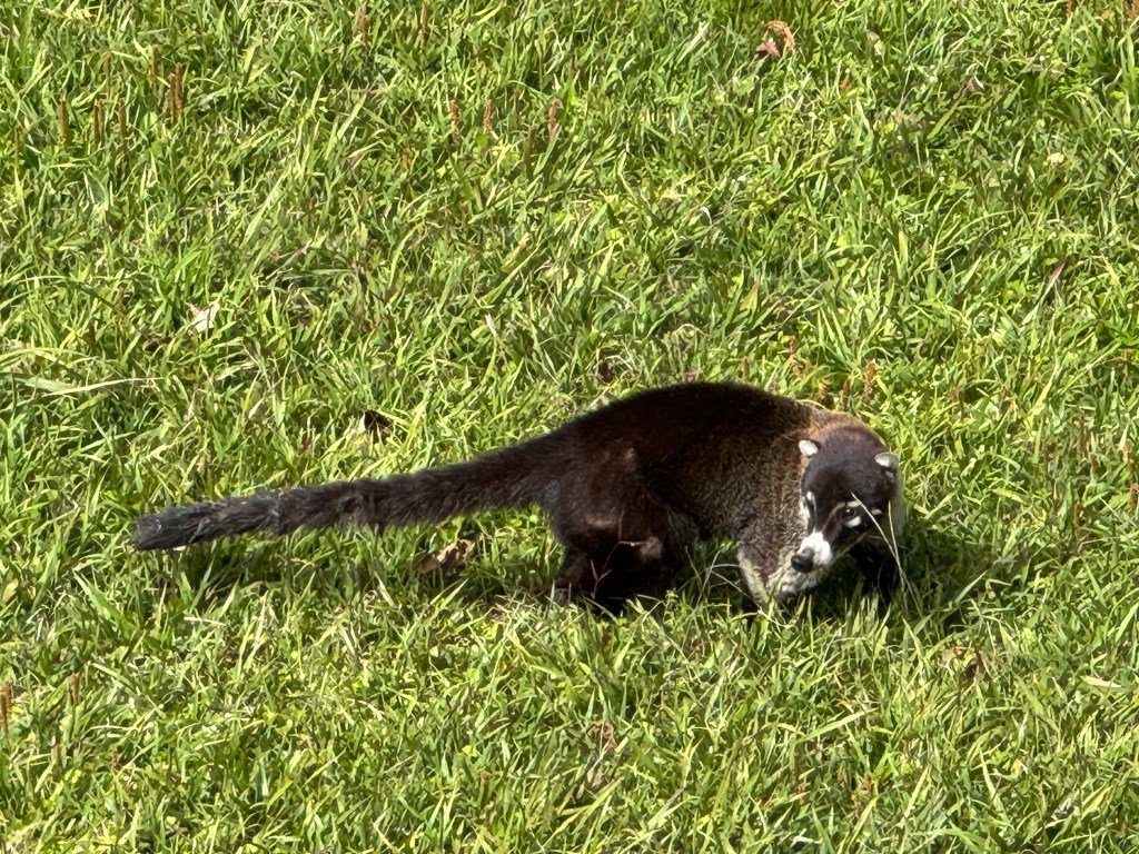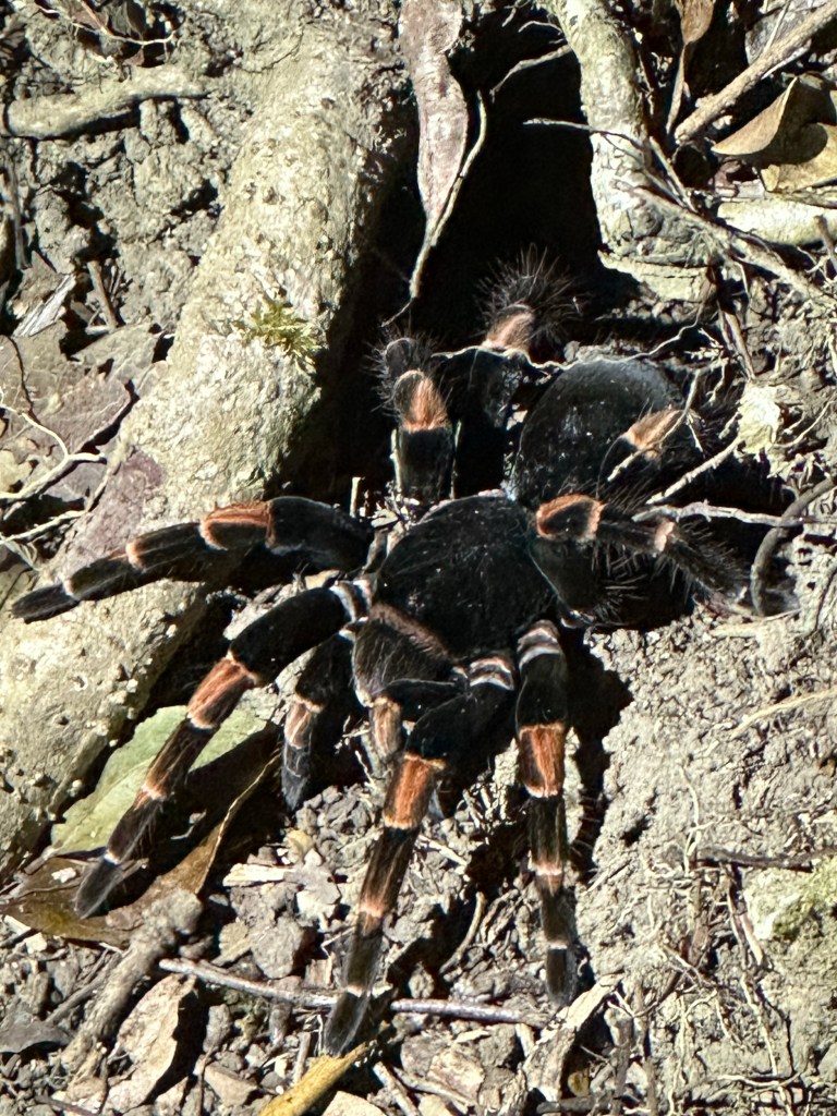 Our journey from Arenal to Monteverde was partly by boat, crossing Costa Rica’s largest lake – man made with the creation of a hydroelectric dam in 1979 and producing 17% of the country’s electricity“View point” on the journey up into the cloudBroad winged hawk by the road side on our journey View from our lodge when there were brief breaks in the cloud, Pacific Ocean in the distance One of the hiking trails around our lodgeForest fungiWe would have missed many things without a guide such as this thorn insect ….and this grass hopperThe “strangler tree”Violet sabre wing hummingbird outside our lodgeLesson’s motmot (some of our photos were taken through our guides’ telescopes)White nosed coati outside our roomOn our final evening we did a guided night hike for around two hours. We saw sleeping birds, insects, an armadillo and tarantulas (at a safe distance).