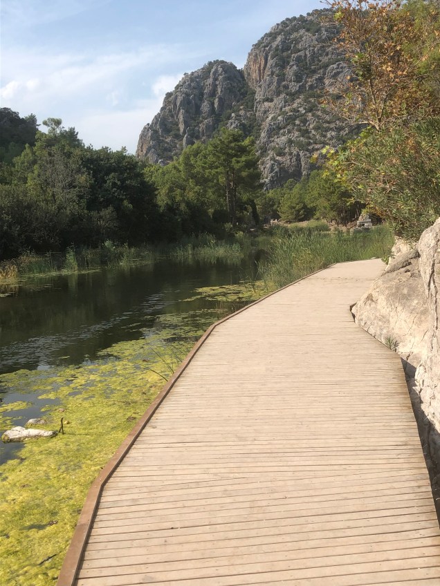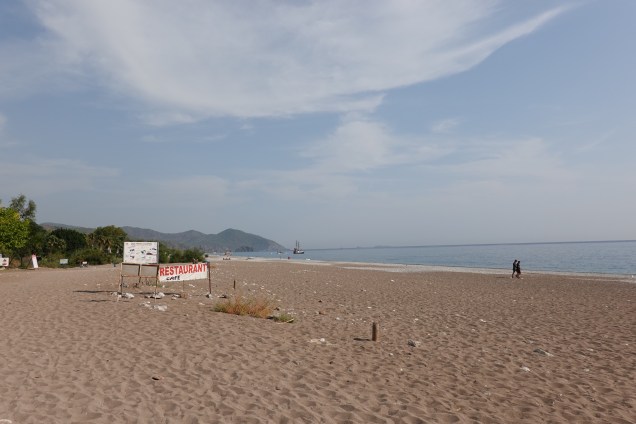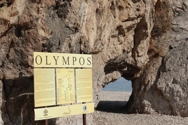 At the end of the beach and at the foot of steep mountains, are the ruins of Olympos, a major Lycian city. Three kilometres away are the legendary flames of Chimaera which have burned for hundreds of years as a result of natural methane gas from the rocks. Unfortunately we will have to visit Chimaera next time as a rare, but heavy, storm kept us away.