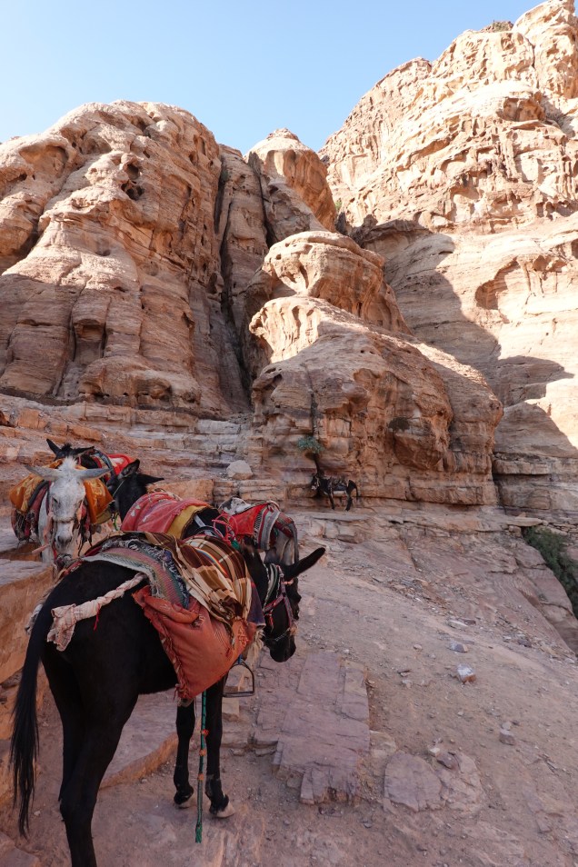 Until the 1980s a Bedouin tribe lived in the site. As part of an arrangement with the government for them to move to a nearby purpose built village, they have retained the exclusive rights to trade within the site. For the men, this takes the form of horse, donkey and carriage rides and refreshment stalls. The women sell souvenirs such as clothing and jewellery, made by locals trained by the Queen Noor Foundation. One such stall holder is a women from New Zealand who came to Petra as a traveller in the 1970s and fell in love, subsequently marrying, a local souvenir seller. On her stall, as well as the souvenirs, is the book she has written “Married to a Bedouin” of her remarkable life.