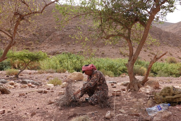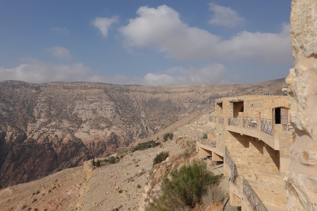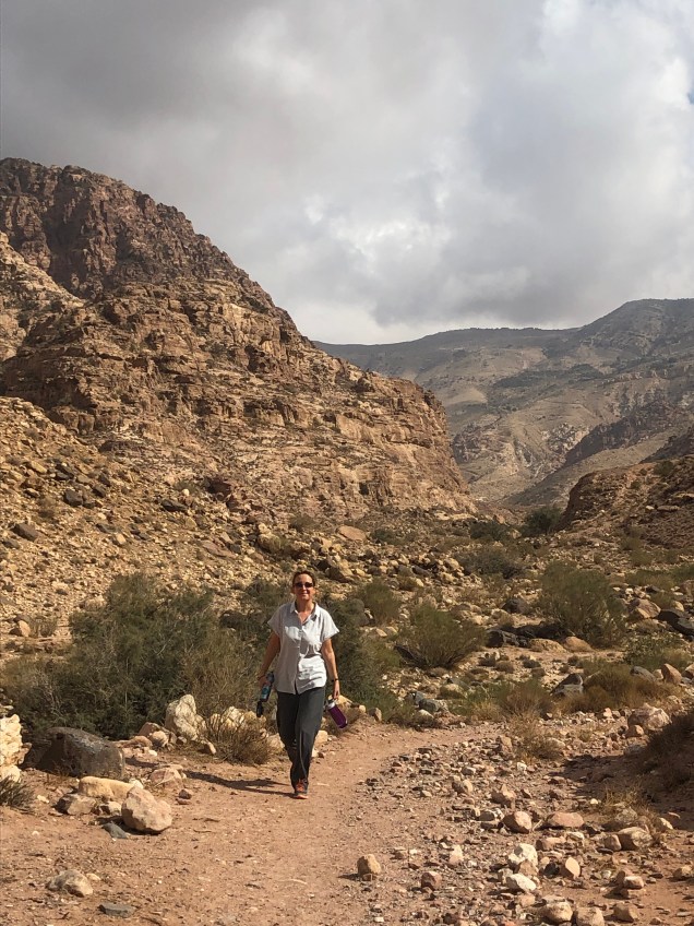 After a night in a guesthouse, our bags were collected and we began the hike to our next stop at Feynan. We had woken to a thick blanket of mountain cloud. As we set off this cleared to reveal the track ahead of us – 16km through the Wadi, starting at 1,250m and ending at 375m. The steepest section is the first 2km – our legs will remember it for some time. A local guide provided “trekking poles” made from broken off branches and brewed Bedouin tea with our lunch.