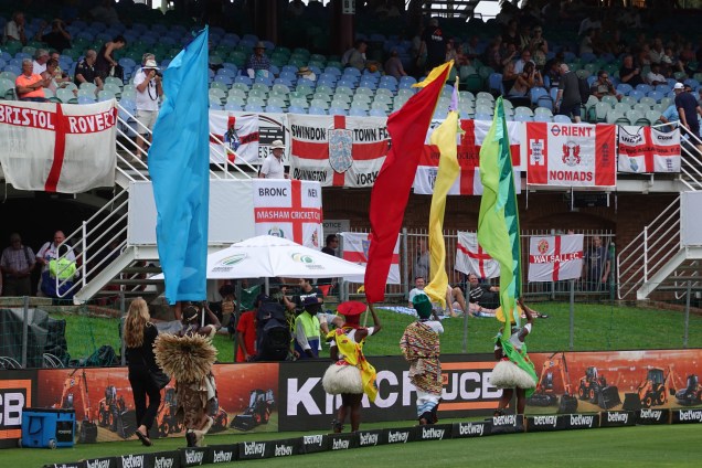 We sat in the Duck Pond stand which has framed newspaper articles from the late ’60s and early ’70s describing the lead up to, and fall out from, the D’Oliveira debacle; a reminder of how things have changed. Our fellow fans were predominantly English – sporting their home caps, shirts and banners including “Somerset cricket – Dave’s 60th birthday tour” – and discussing beer prices, where to have dinner, the merits of sit on lawn mowers…..and occasionally the cricket. The St Georges band outshone the “choir” of the Barmy Army.