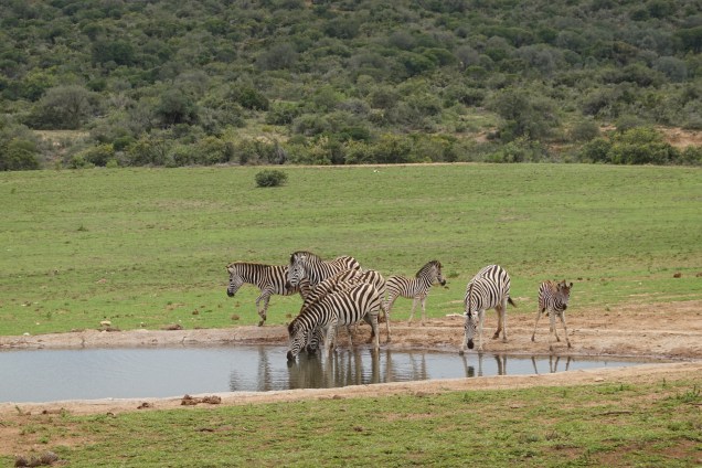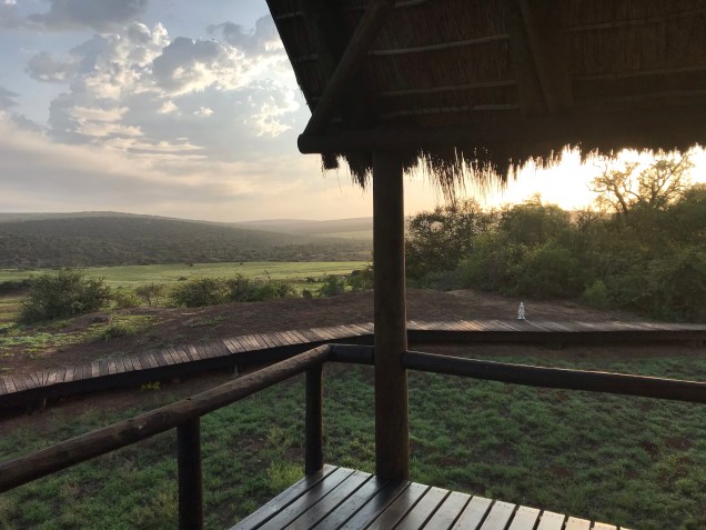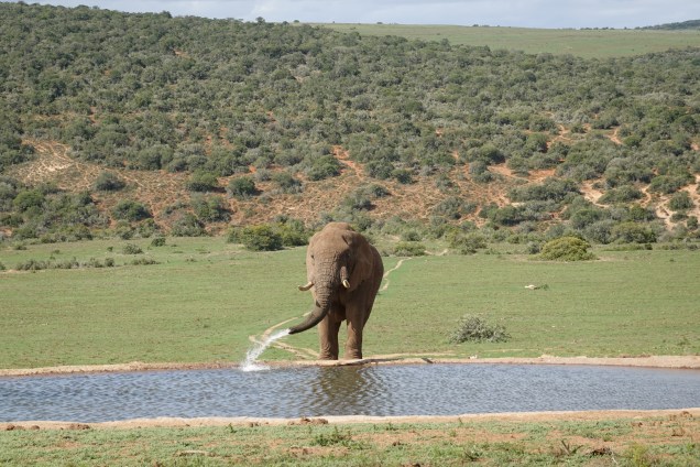 Gorah elephant camp is a private concession in the Addo National Park. It is based upon a historic lodge built by a farming family in 1856, together with 11 guest “tents” (of the luxury variety !). Neither the lodge nor the tents are fenced and animals are free to wander around the property, including the watering hole in front of the lodge. After dark you need to be escorted from the lodge to your tent to ensure your safety; just before we arrived five lions had been seen just outside our tent !