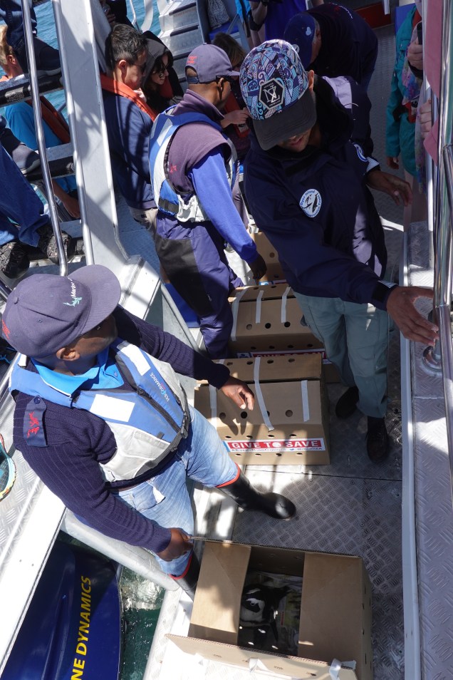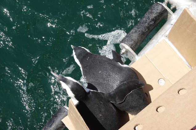 The highlight of our trip was that our boat was used by a conservation team to release nine injured penguins back into the wild to rejoin their colony. The penguins had been hurt in attacks by seals and sharks before being rescued and rehabilitated. The penguin population has been much depleted by human intervention, for example their nesting material has been harvested for use as fertiliser. Local charities are now providing nesting boxes.