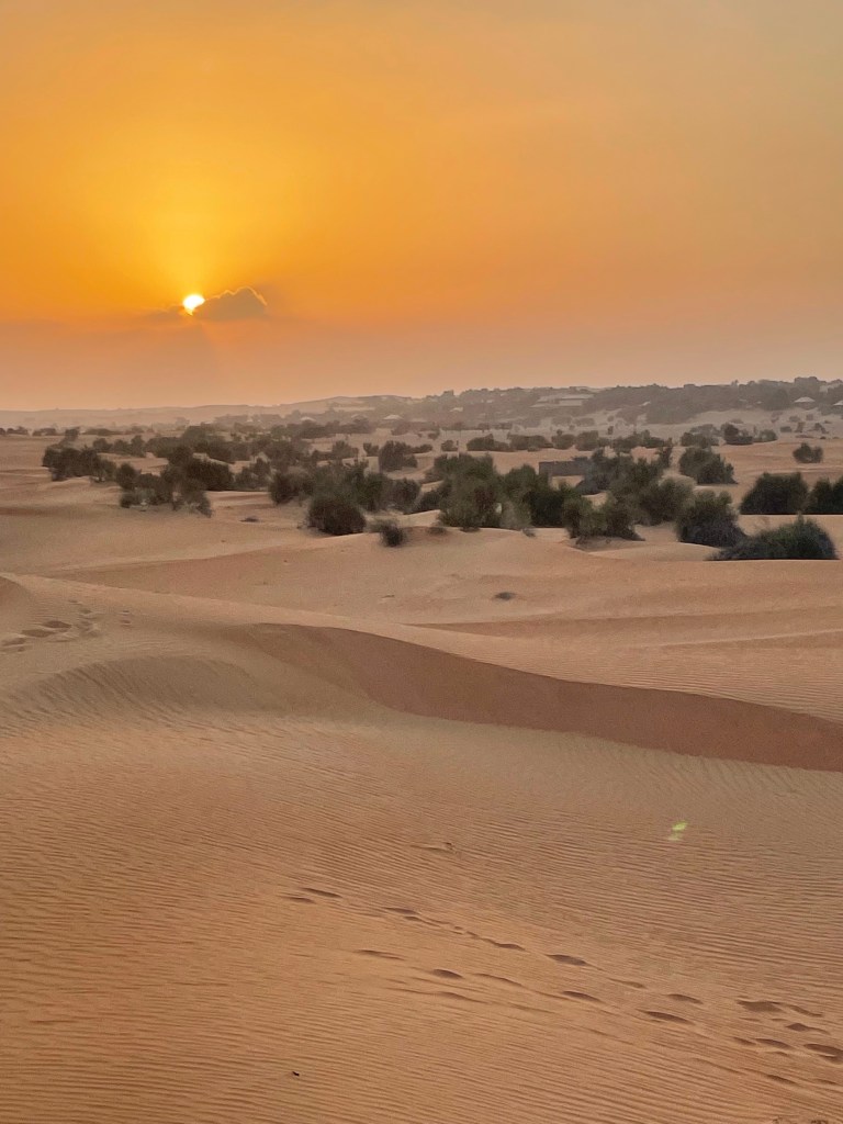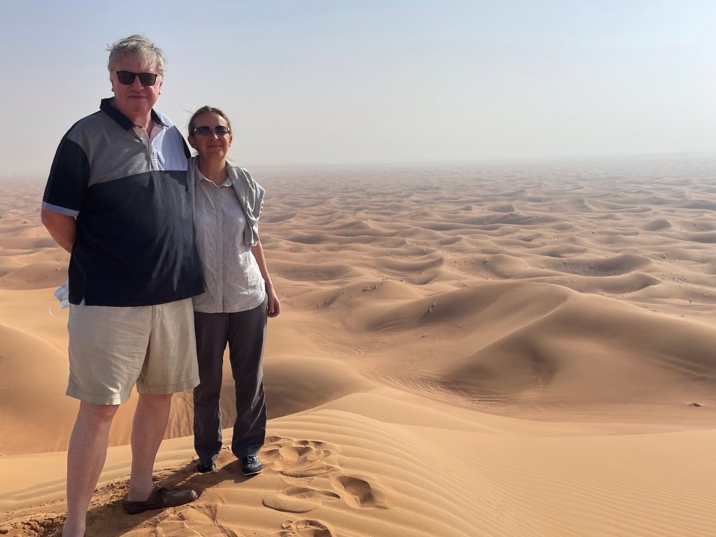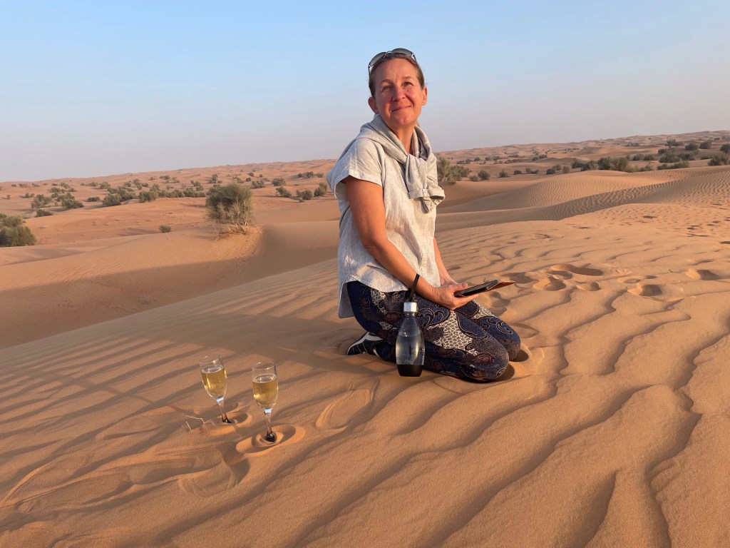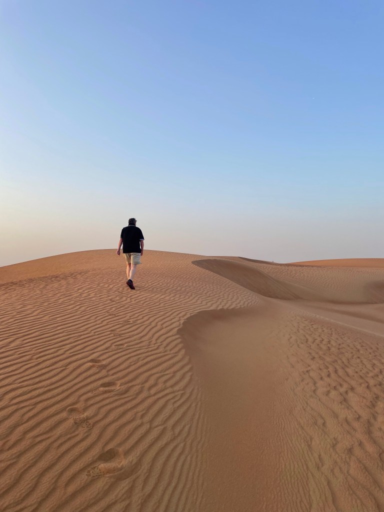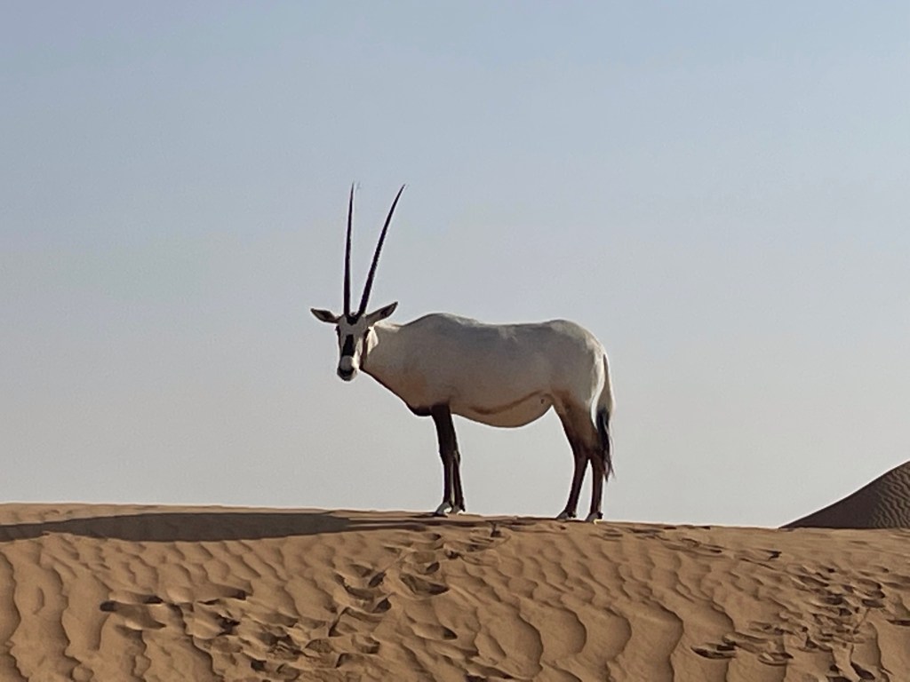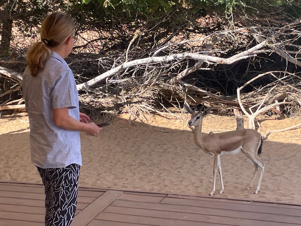 The hotel comprises 40 “tents”, all overlooking spectacular desert scenery. We took full advantage of the activities on offer to guests – nature walk/drive, falconry, “dune bashing” in a 4×4 and a private desert dinner (for which we were provided with a local mobile phone in the event of snake/scorpion emergencies; thankfully not needed.)