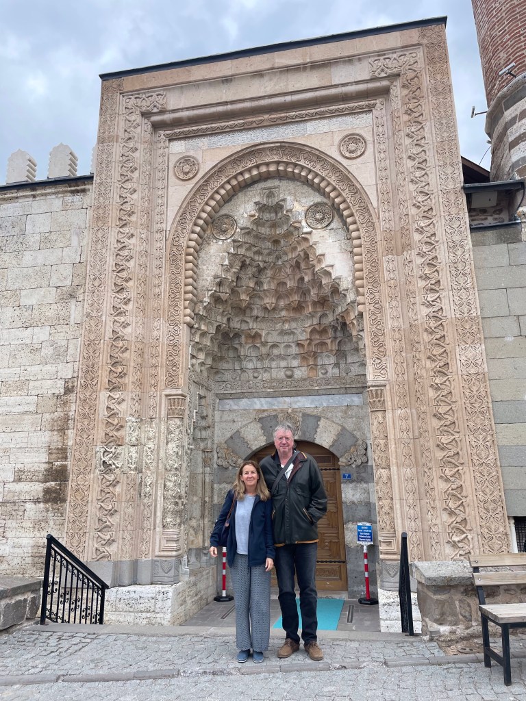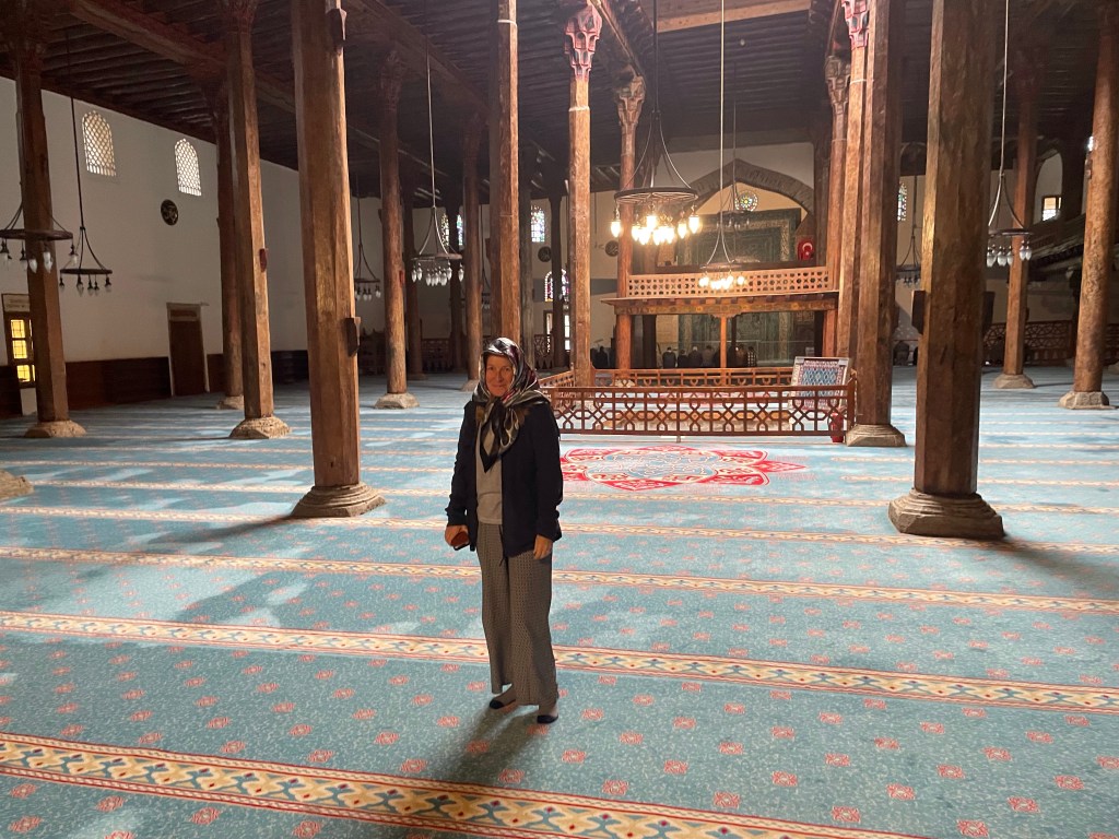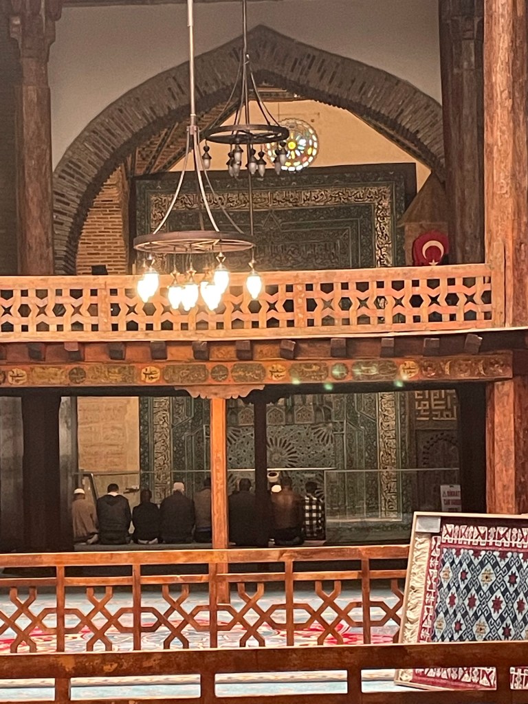 The final stop before Konya was to visit a 13th century mosque in Beyşehır. Eşrefoğlu was built between 1296 and 1299 and features on the UNESCO world heritage site tentative list. Its roof is supported by 42 wooden columns. We were surprised to be allowed in during prayers with Sarah allowed in through the the mens’ entrance.