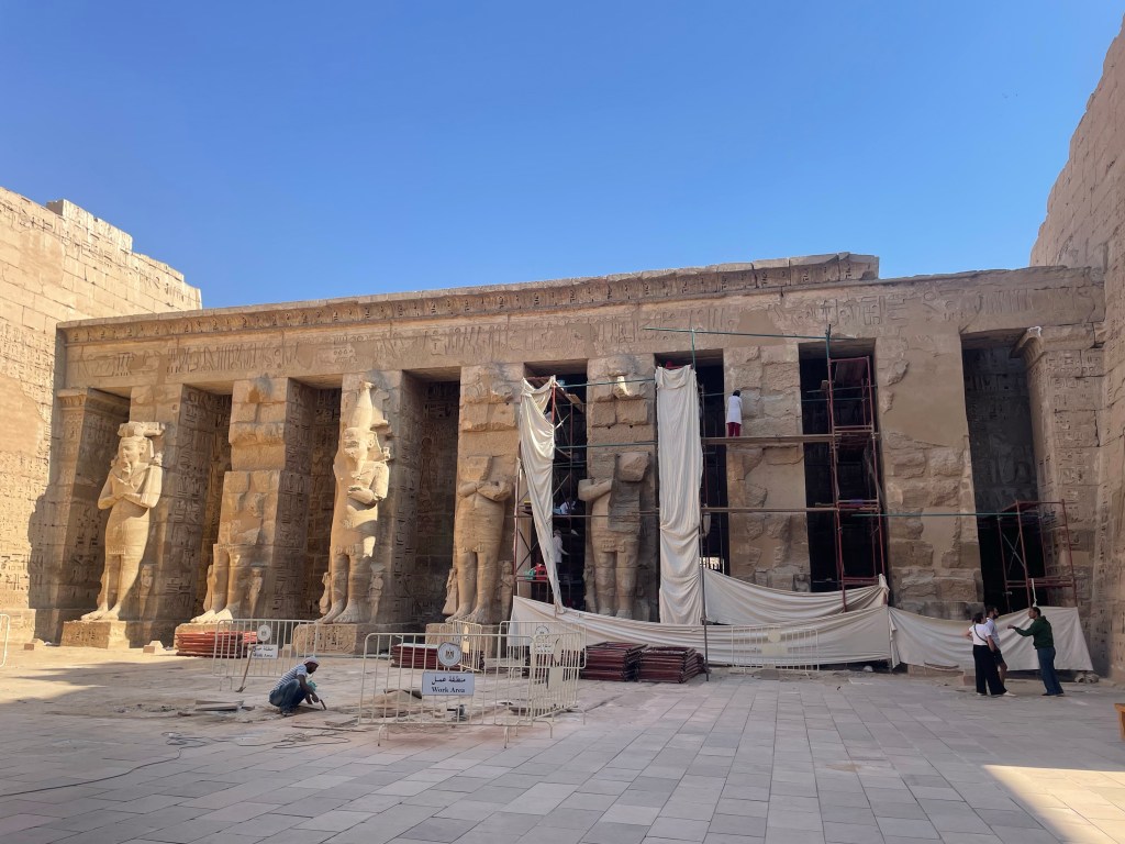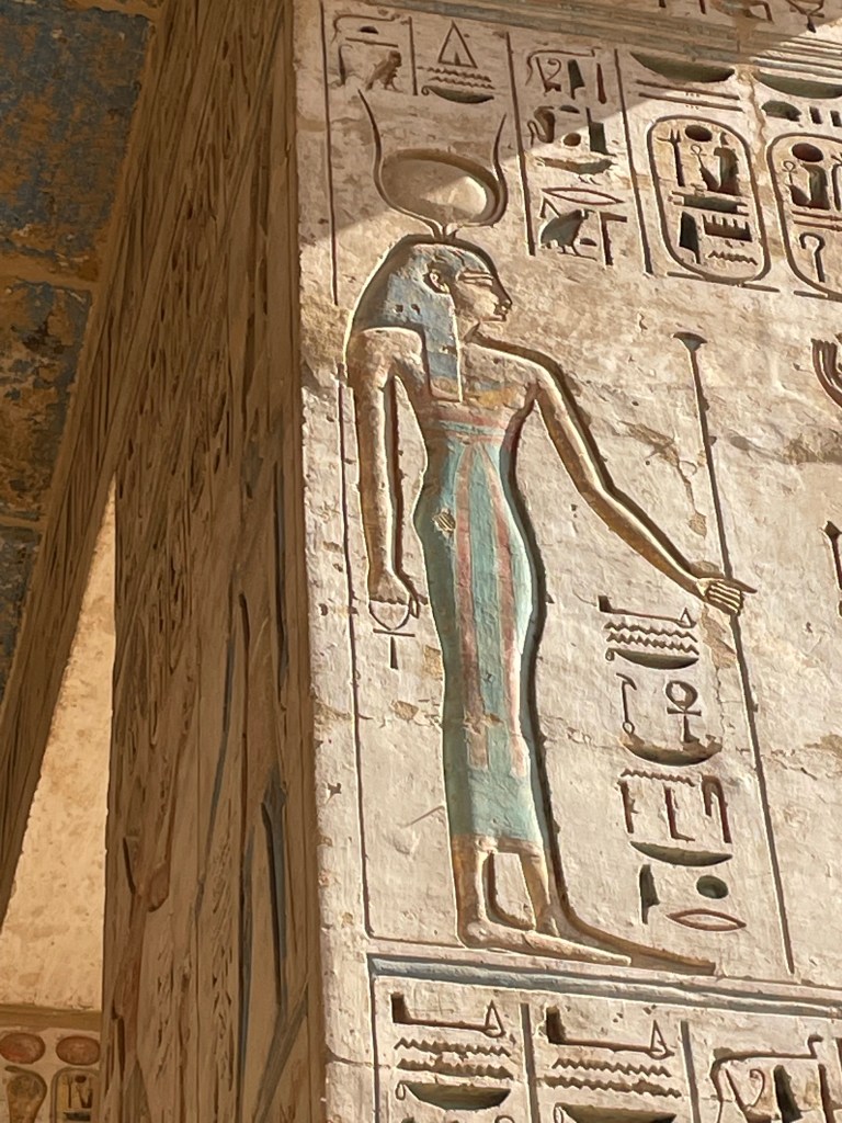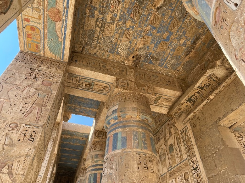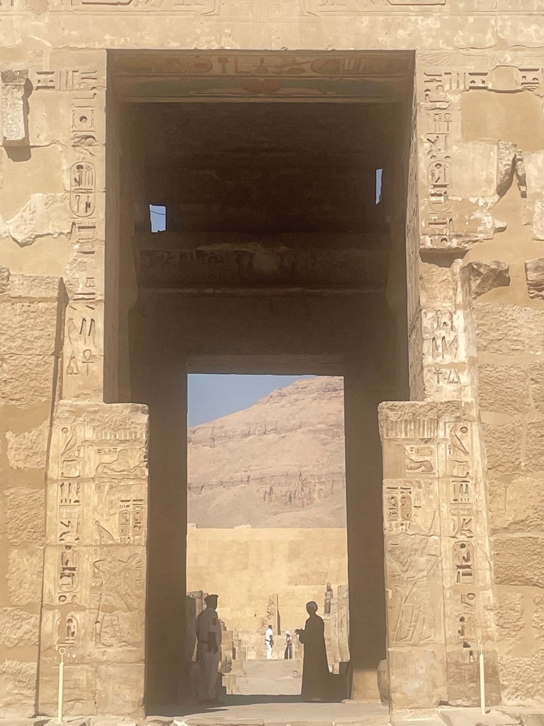 This is a memorial temple built by Ramses III (1186-1155 BC) dominated by Funery Temple. It is close to the Valley of the Kings on the “West Bank” of the Nile, opposite the main city of Luxor which is predominently on the “East Bank”.