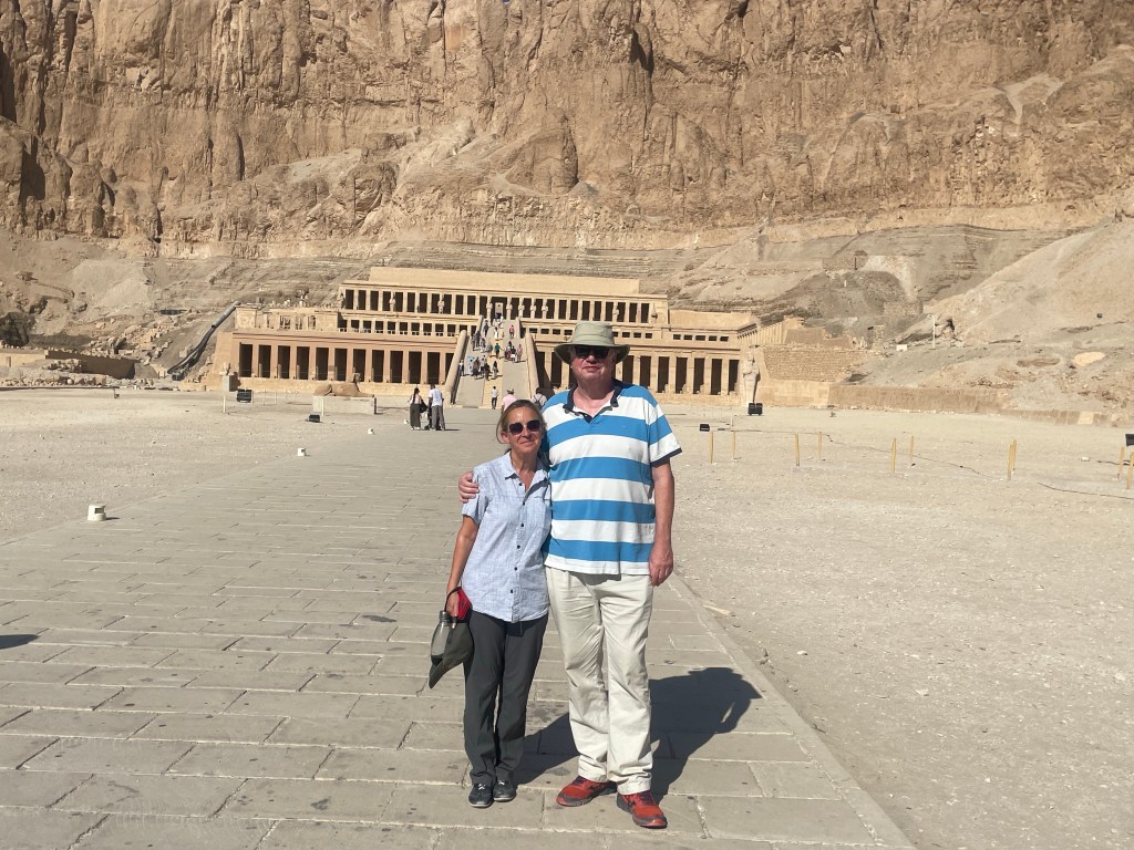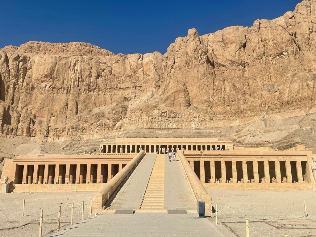 Hatshepsut (1473-1458 BC) was rare in being a female pharaoh. Initially she ruled as regent for her infant nephew and step-son, the future pharaoh Tuthmosis III (1458- 1425 BC) but then became pharaoh in her own right. It is believed that the temple was defaced by Tuthmosis III in an attempt to erase her from history.