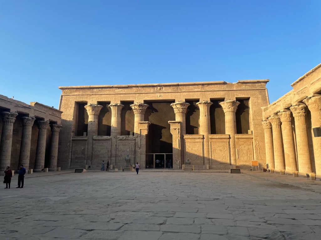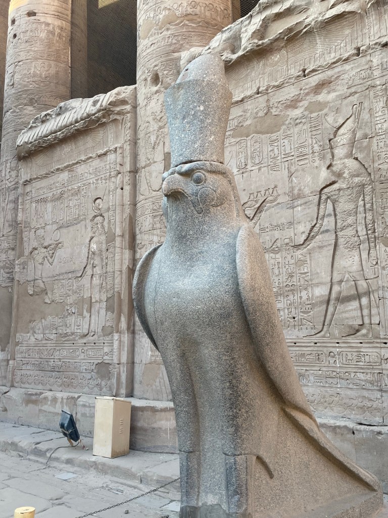 The temple is dedicated to Horus, the son of Isis and Osiris, the falcon headed god, commonly seen branding current Egyptian companies. The temple was built in the Greek Ptolemaic period and completed by the father of Cleopatra VII (the one played by Elizabeth Taylor). It is one of the best preserved.