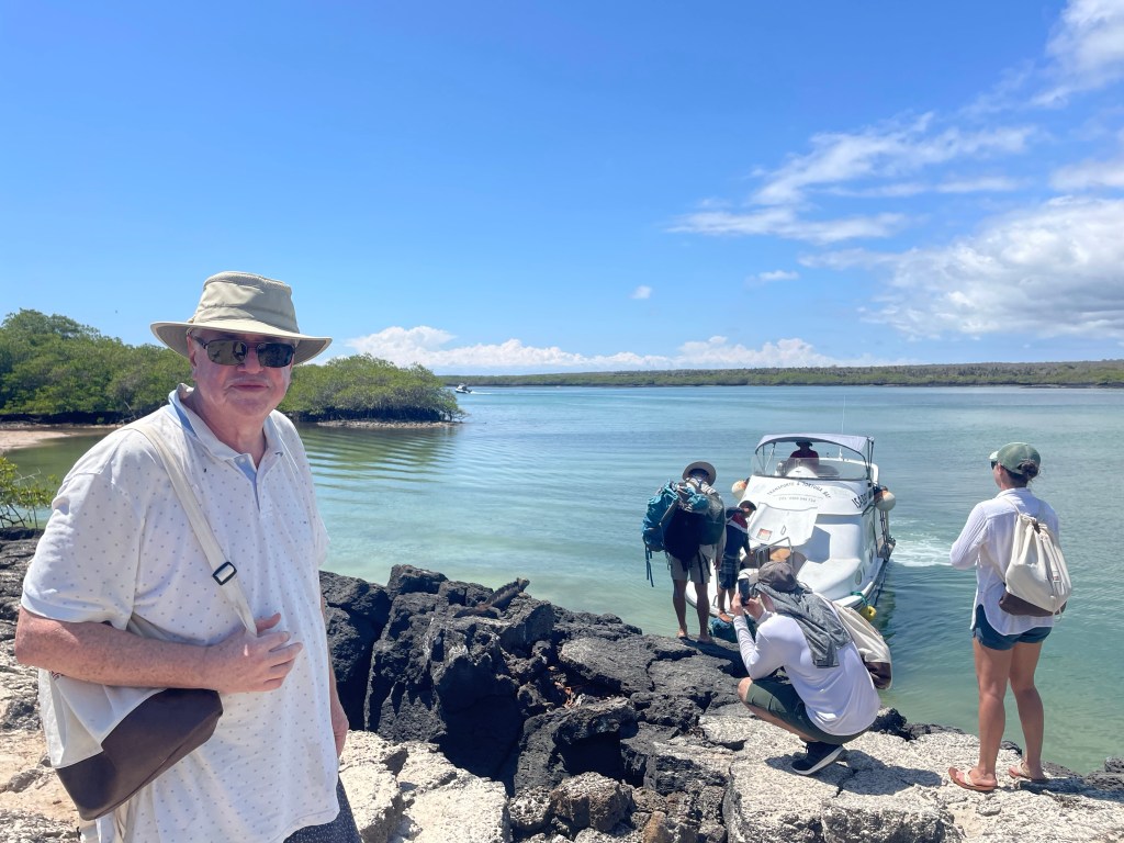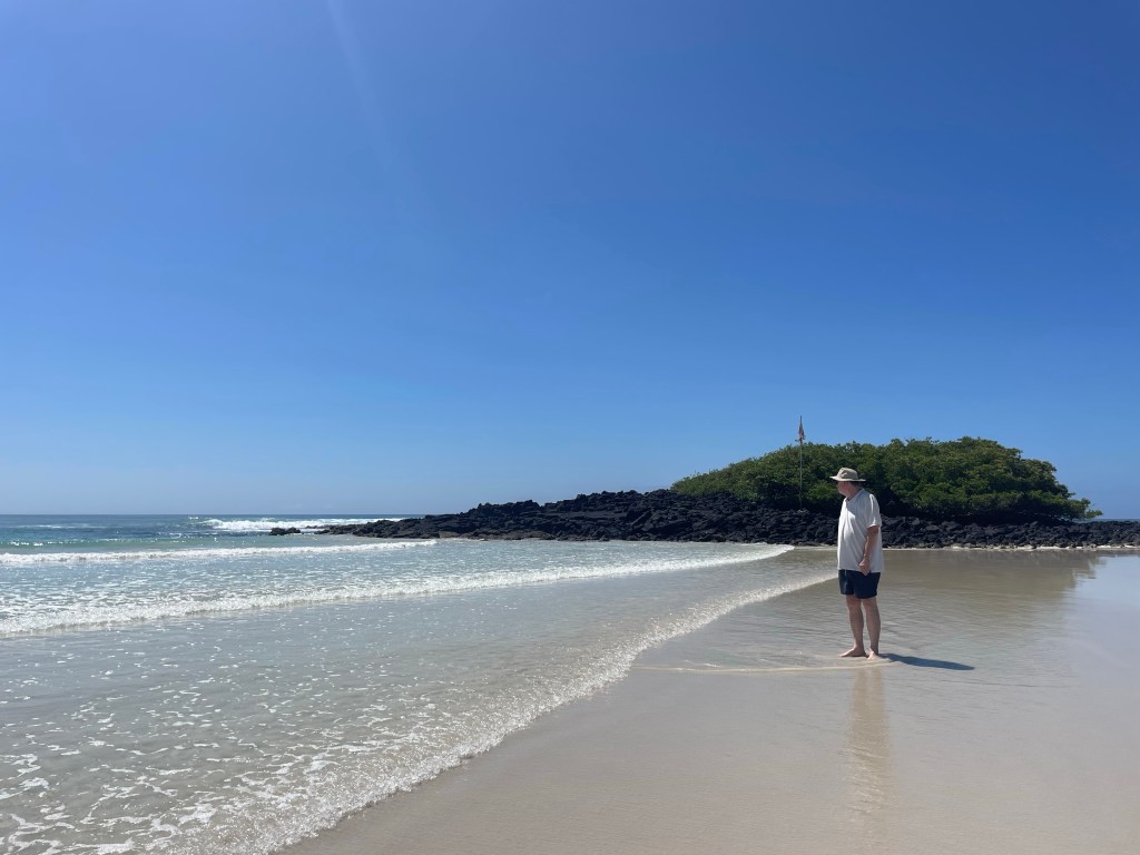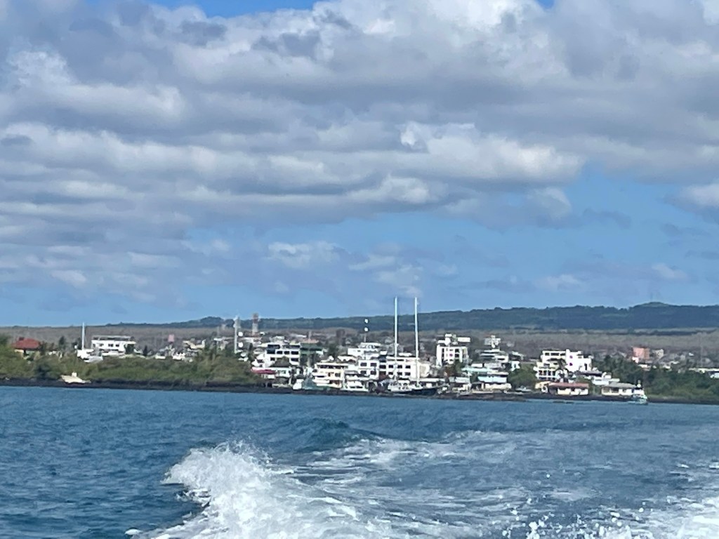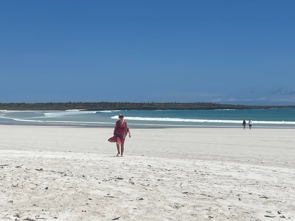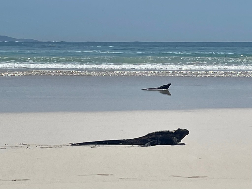 This bay is a 20 minute speed boat from the main town of Santa Cruz, Puerto Ayora. On one side is a white sandy beach with surf where marine iguanas feed. The Galapagos marine iguanas evolved from land iguanas because of the plentiful seaweed to feed on. The islands can be dry and food limited for the vegetarian land iguanas.