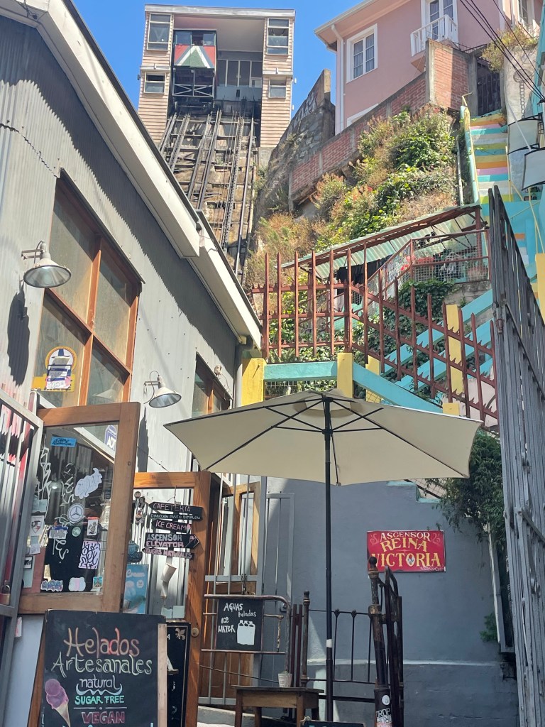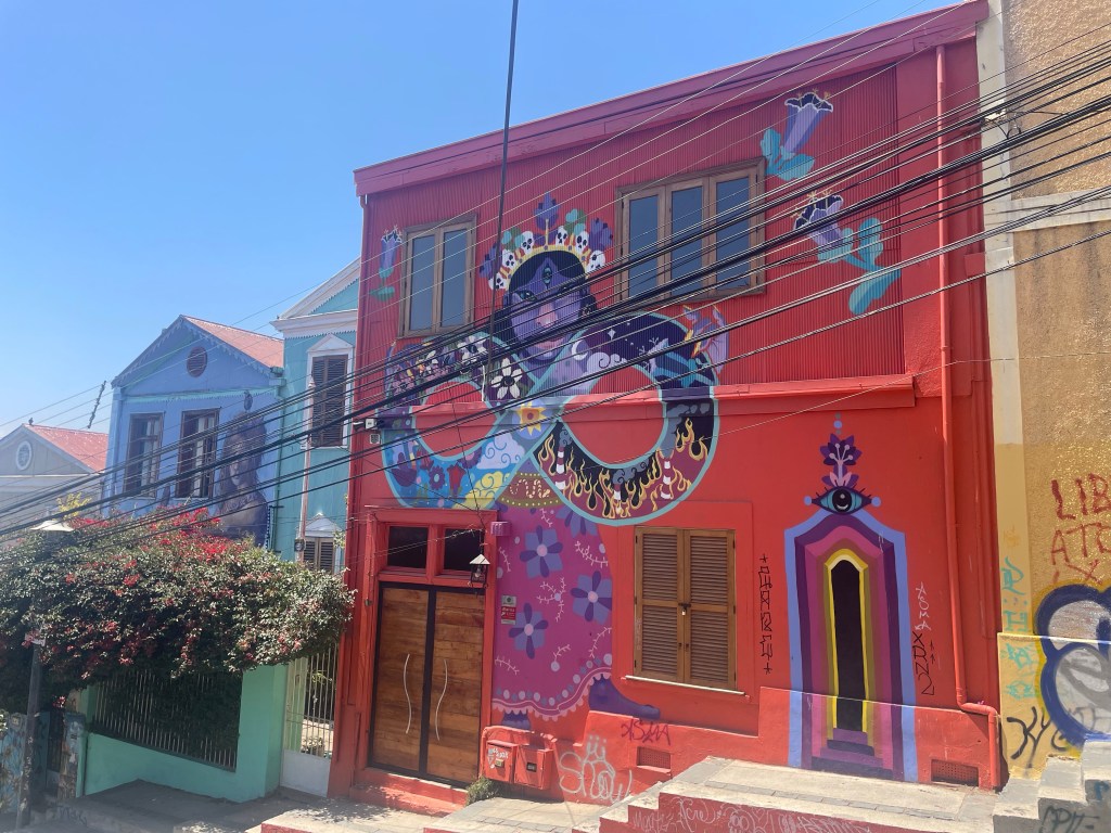 Valparaiso has been described as a dilapidated, colourful, poetic wonderful mess. From the times of Spanish colonialism and English seamen, including Sir Francis Drake, it was a major stopping off port for ships rounding Cape Horn. During the Califonian gold rush of 1849, mining supplies came through Valparaiso. It lies on the coast, 116km from Santiago, but with a very different climate – the day we visited, Santiago reached 36 C and Valparaiso 22 C, with cloud and a cold wind until lunchtime.