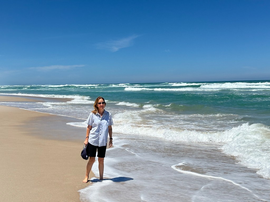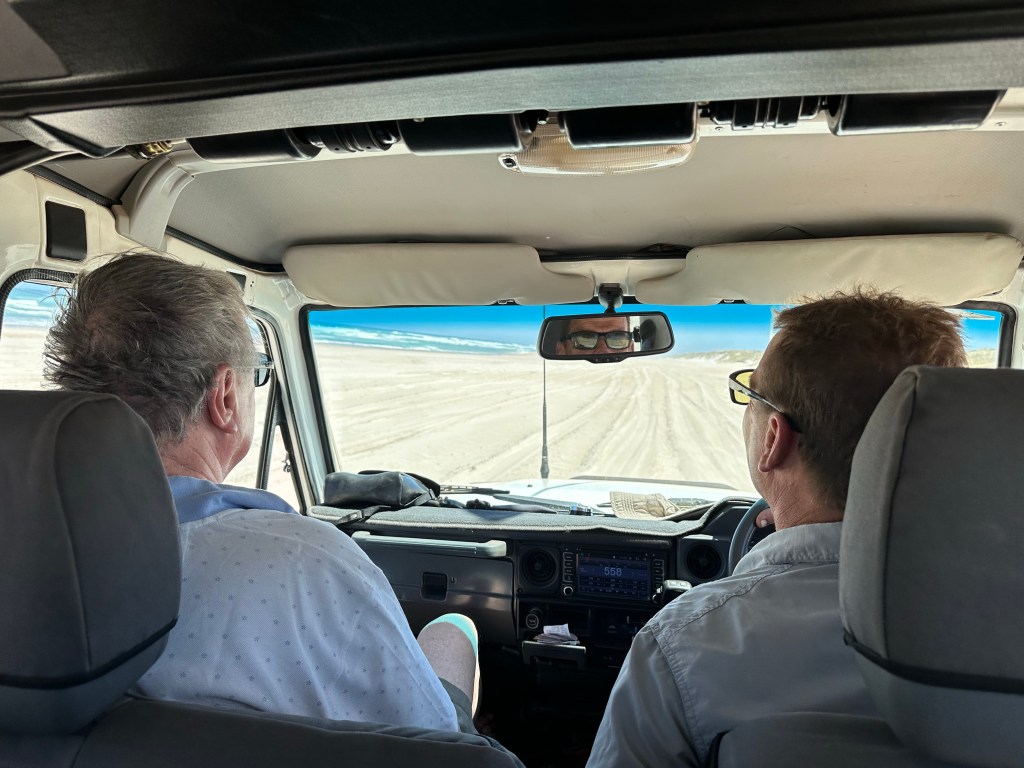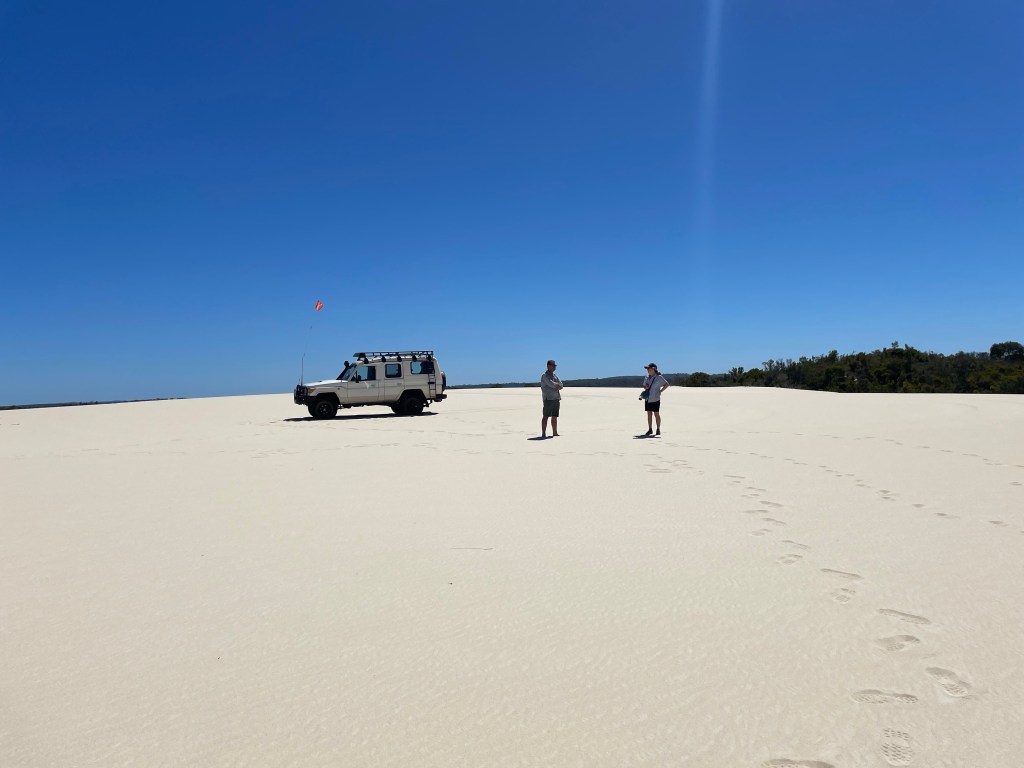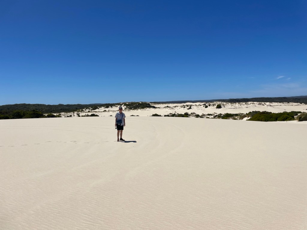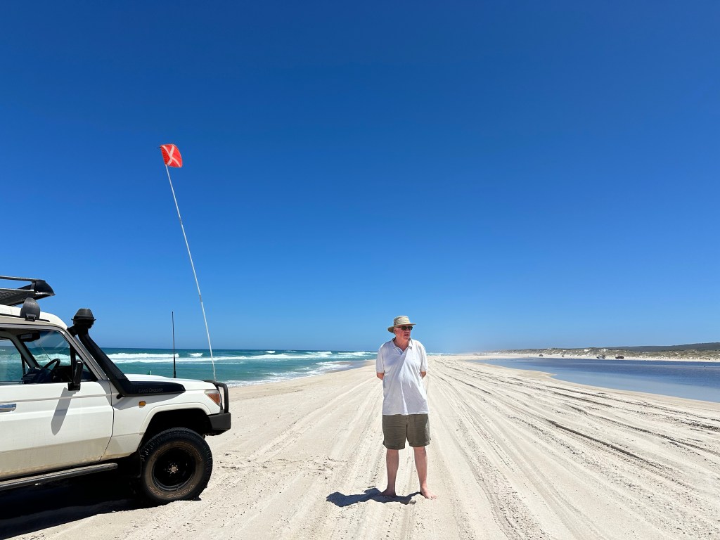 DNP is 130km long stretching along the south coast of Western Australia. It is named after a French admiral who was the first European to sight the area in 1792. To the chagrin of the locals he never actually set foot on the land bearing his name. The park contains beaches, dunes, forests and rivers. Much of the DNP is only accessible by 4WD vehicles which have had their tyre pressure reduced. There is a map symbol for such roads, of which there are quite a few in Western Australia. As our hire car was far from suitable, we found via the internet Graeme, a guide and local eco expert with all the gear required to take us across rough terrain, through the dunes and onto a 30km almost empty beach.