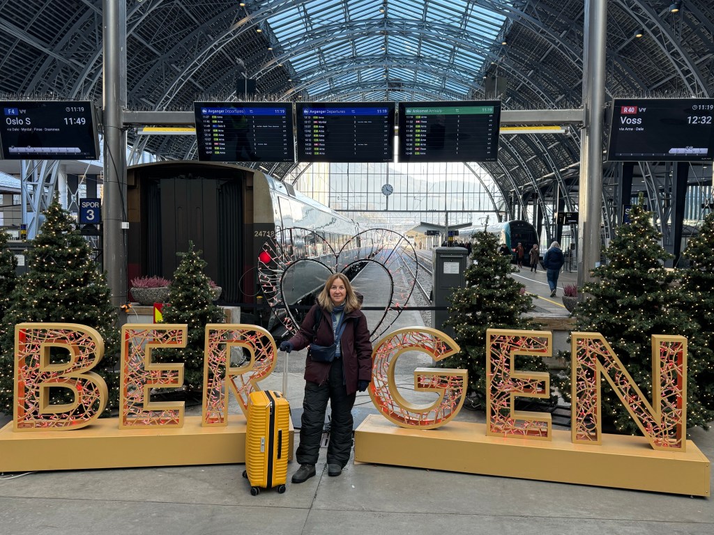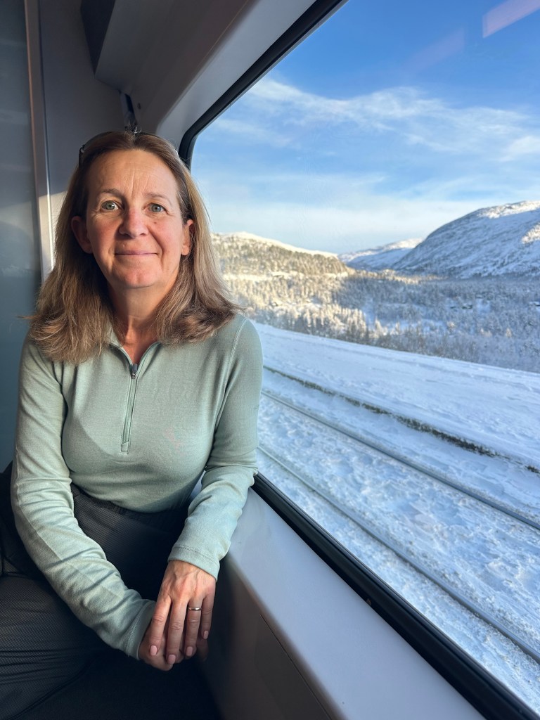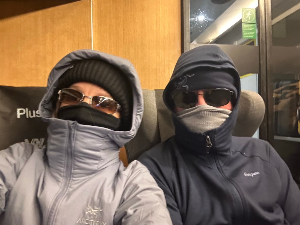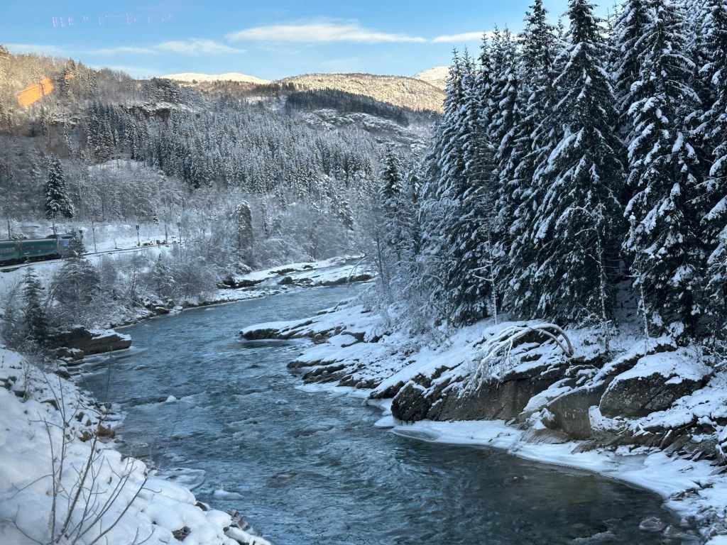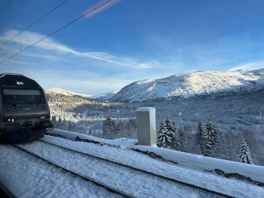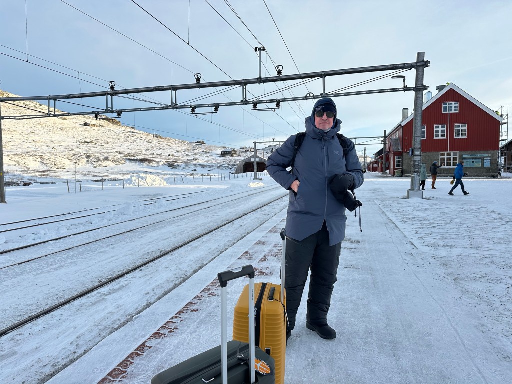 The first leg of our train journey to Oslo was the two and a half hour trip to Finse. Finse is the high point of this route (and the highest point in Norway’s rail network) at 1,222 m. The railway, completed in 1909, was a major infrastructure project to link Norway’s two largest cities. The journey is extremely scenic and the line stays open all year round. When we left Bergen it was 0 degrees and on arrival at Finse it was -7 degrees, but very dry with crunchy snow.