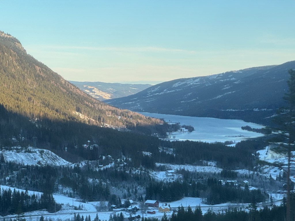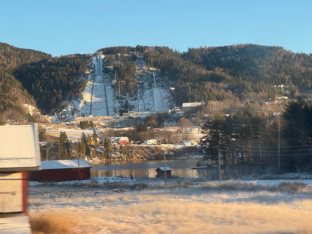 The second part of the train journey is four and a half hours to Oslo. By having a break at Finse it meant that, despite the short days at this time of year, we could do the whole trip in daylight. The first hour to Geilo, a ski resort, is particularly scenic. We also passed the highest ski jump in the world at Vikersund – nine world records have been set there including the current record of 253.5 meters.