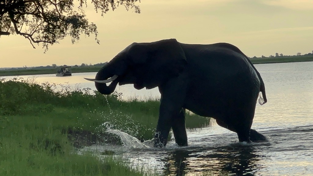 Chobe National Park lies in the north of Botswana and covers 11,700 square km, larger than Devon and Somerset combined. It was created a national park in 1967 and is known for its large population of elephants estimated to be over 45,000. The destruction caused by elephants is such that culls may be considered. We stayed at a lodge just outside the park with views across the Chobe River to Namibia. Our activities were consequently both land and water based.