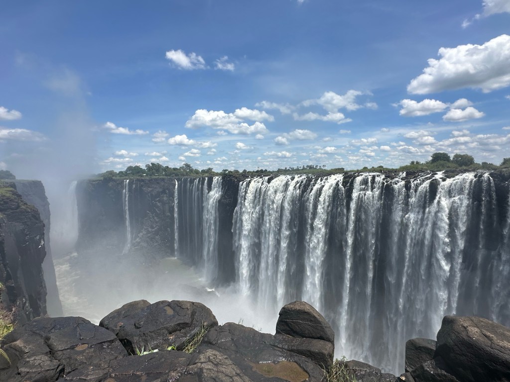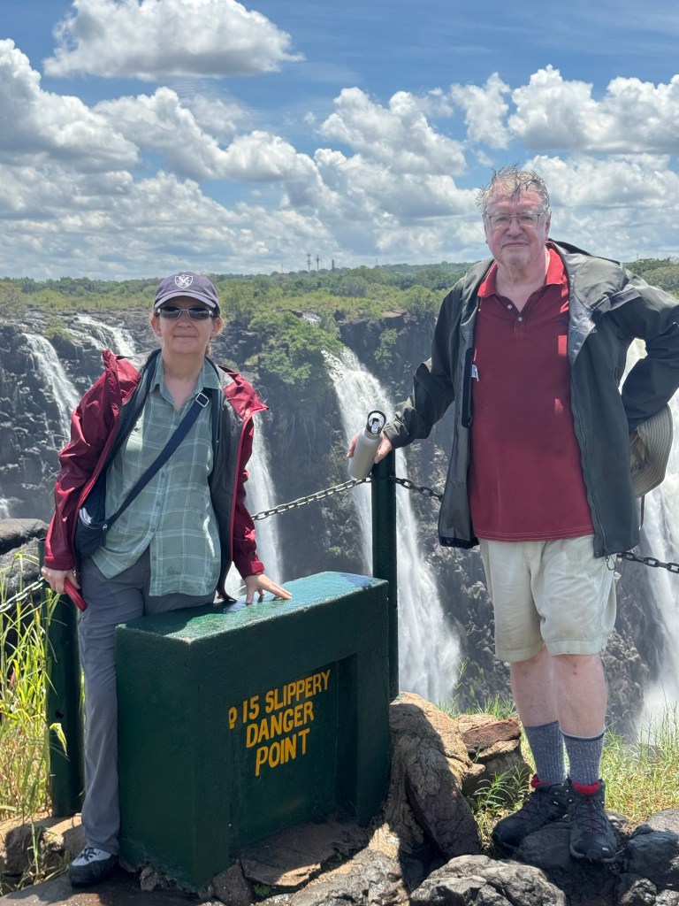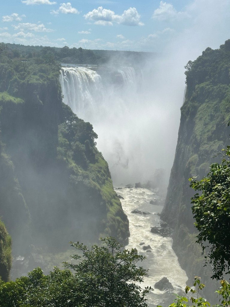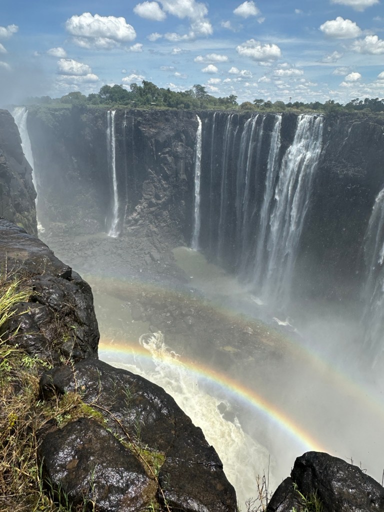The first European to discover the falls was Doctor David Livingstone who first saw the falls on 16 November 1855. He named it in honour of Queen Victoria, its local name being Mosi-oa-Tunya – the smoke that thunders. It sits between Zimbabwe and Zambia on the Zambezi River and is classified as the worlds largest falls, based on combined width (1,708 m) and height (108 m), with other falls claiming the spot based on different combinations of measures ! The volume of water varies considerably by time of year; when we visited it was considered around a mid point.