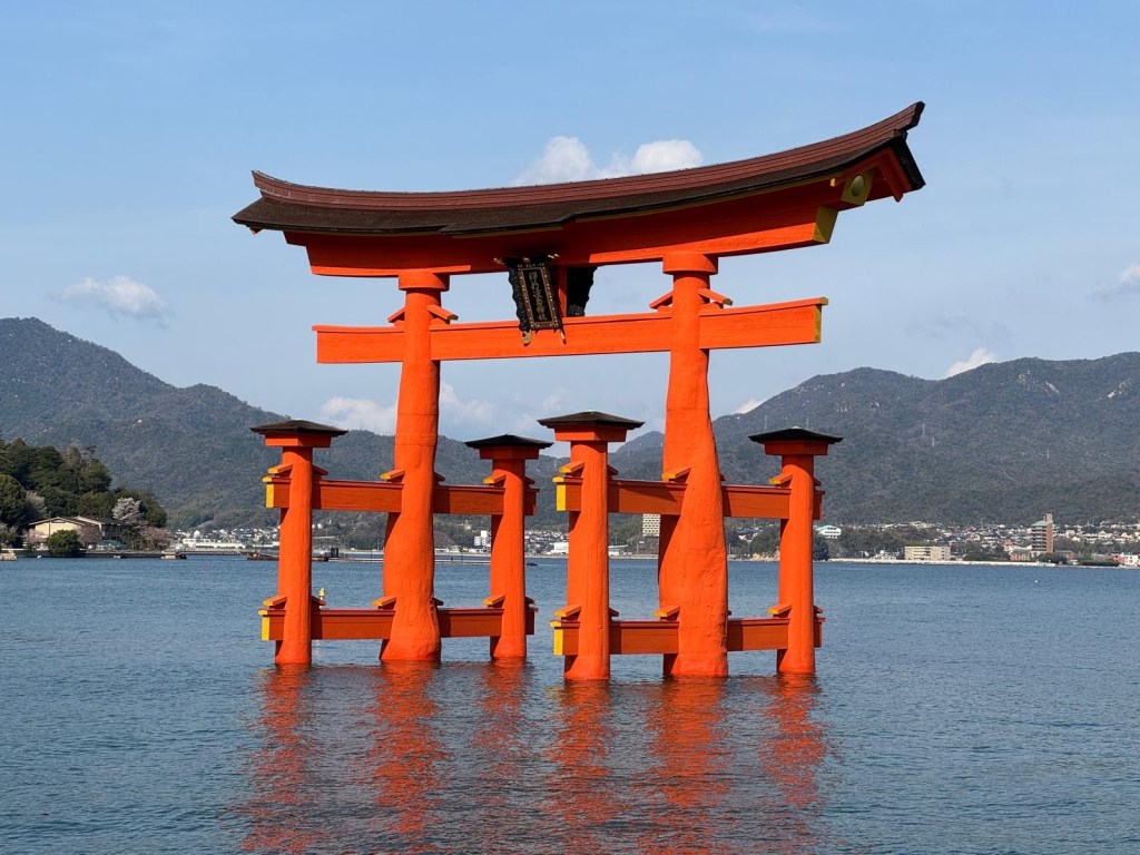 The tori, traditional Japanese gate, of Itsukushima Shinto Shrine sits in the sea, but can be reached at low tide and is one of the most photographed sites in Japan.