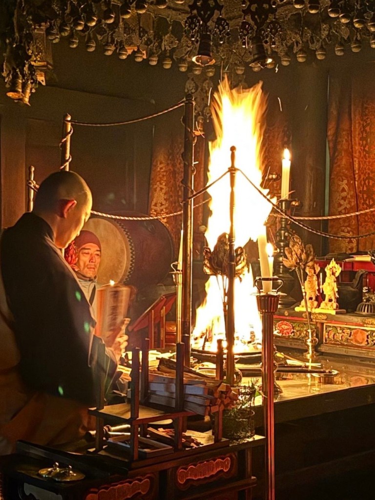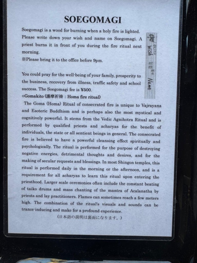 Guests are invited to attend temple rituals and services and the monks and novices were happy to talk about their backgrounds and day to day lives. We attended the 7am prayer service which was followed by the fire ritual and also the evening meditation. At the fire ceremony pieces of wood with wishes written on them are blessed and burned; for a fee guests can write their wishes on one or more.