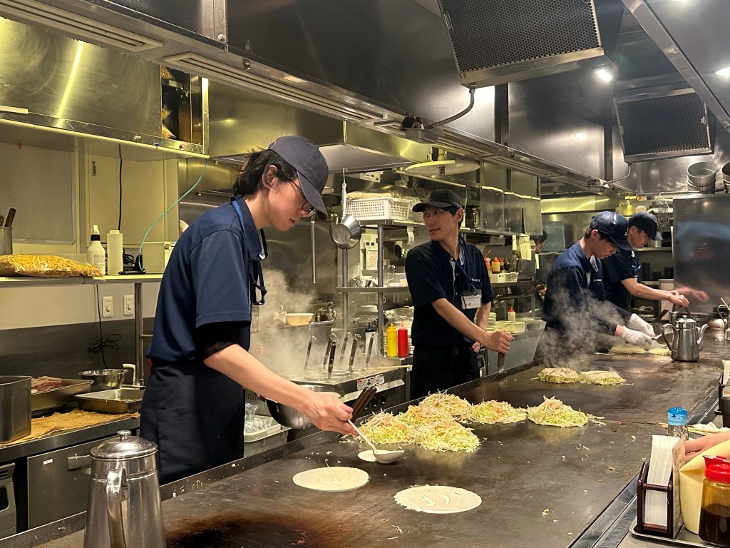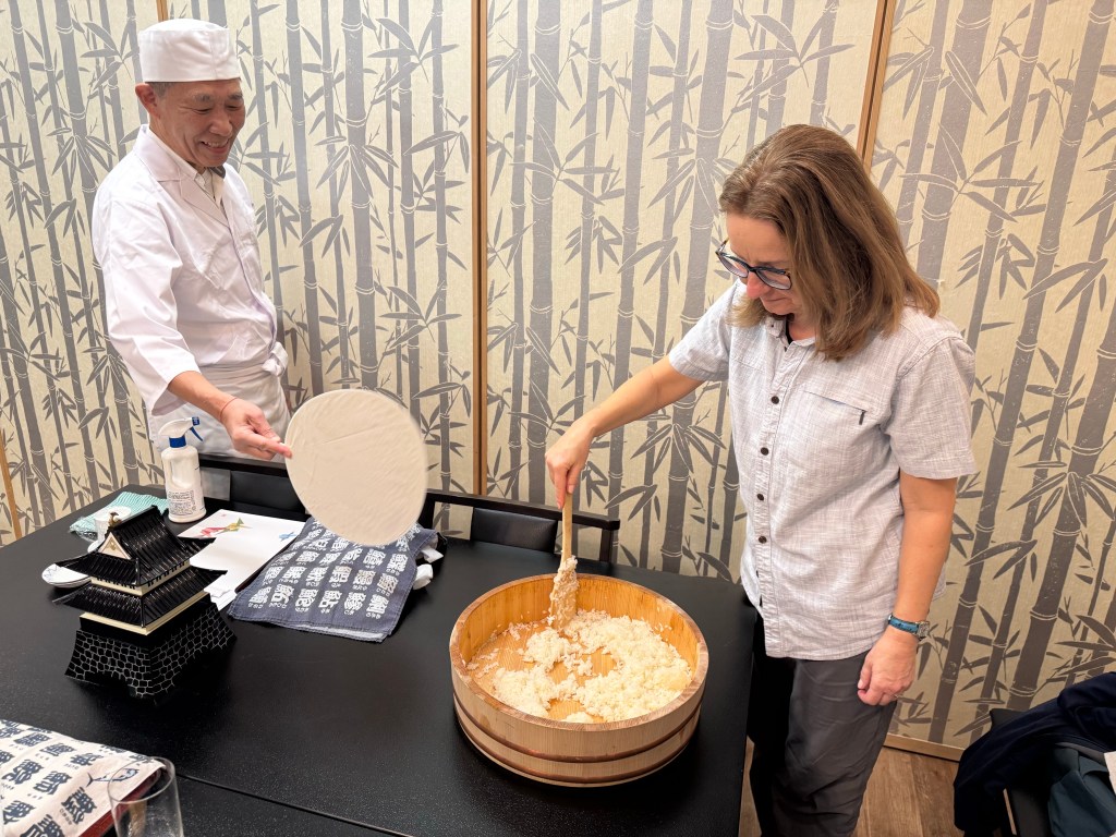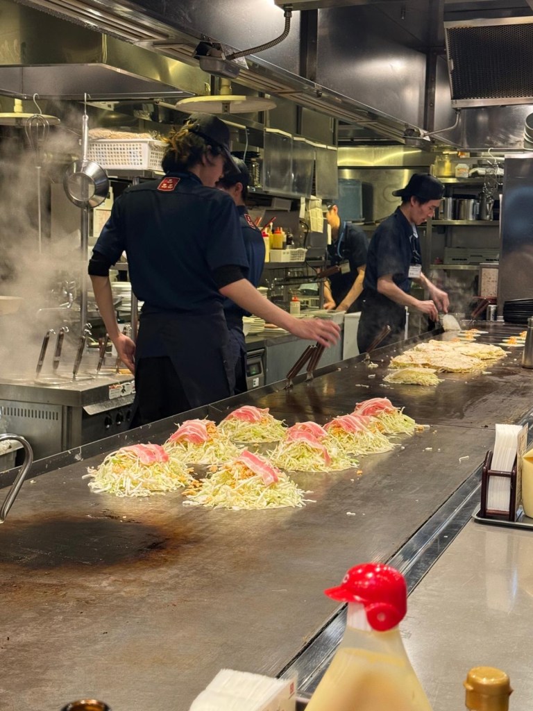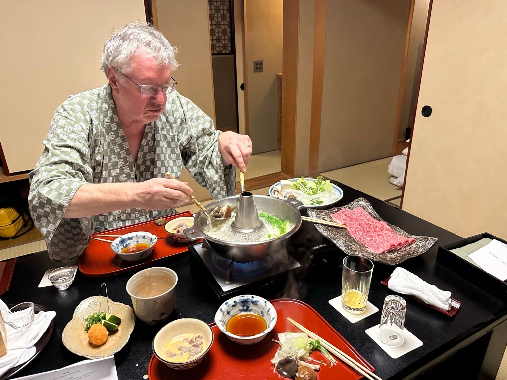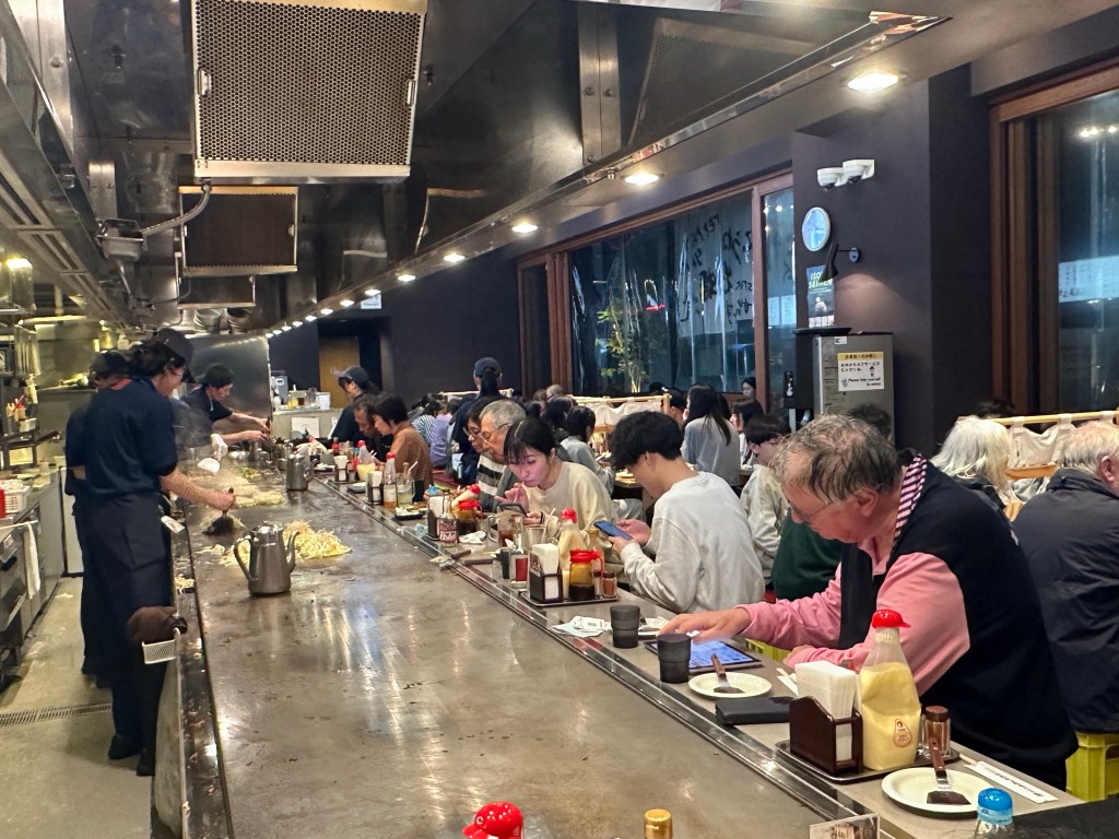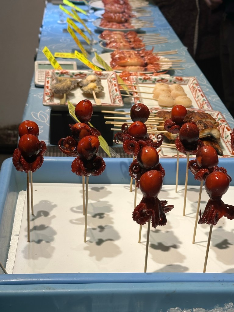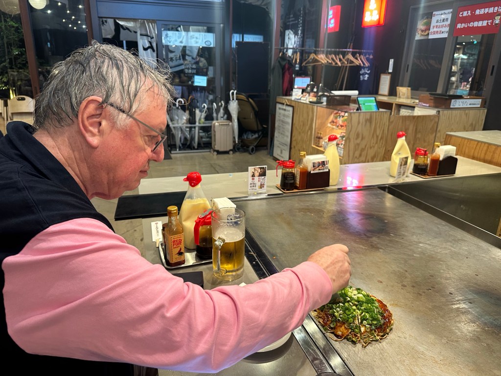 There are many different styles of Japanese food and each restaurant tends to specialise in just one. Some, like sushi, tempura, noodle soup and teppanyaki were familiar to us. But we were introduced to many other styles such as kaiseki; a multi course seasonal meal with no choice, shabu shabu, a hotpot where you cook your own food at the table, yakitori, skewered grilled meat, usually a street food and okonomiyaki, a pancake based meal cooked on a hot plate (also eaten from it if you have a counter seat) with cabbage, noodles, pork and other selected filling topped with a rich sauce.