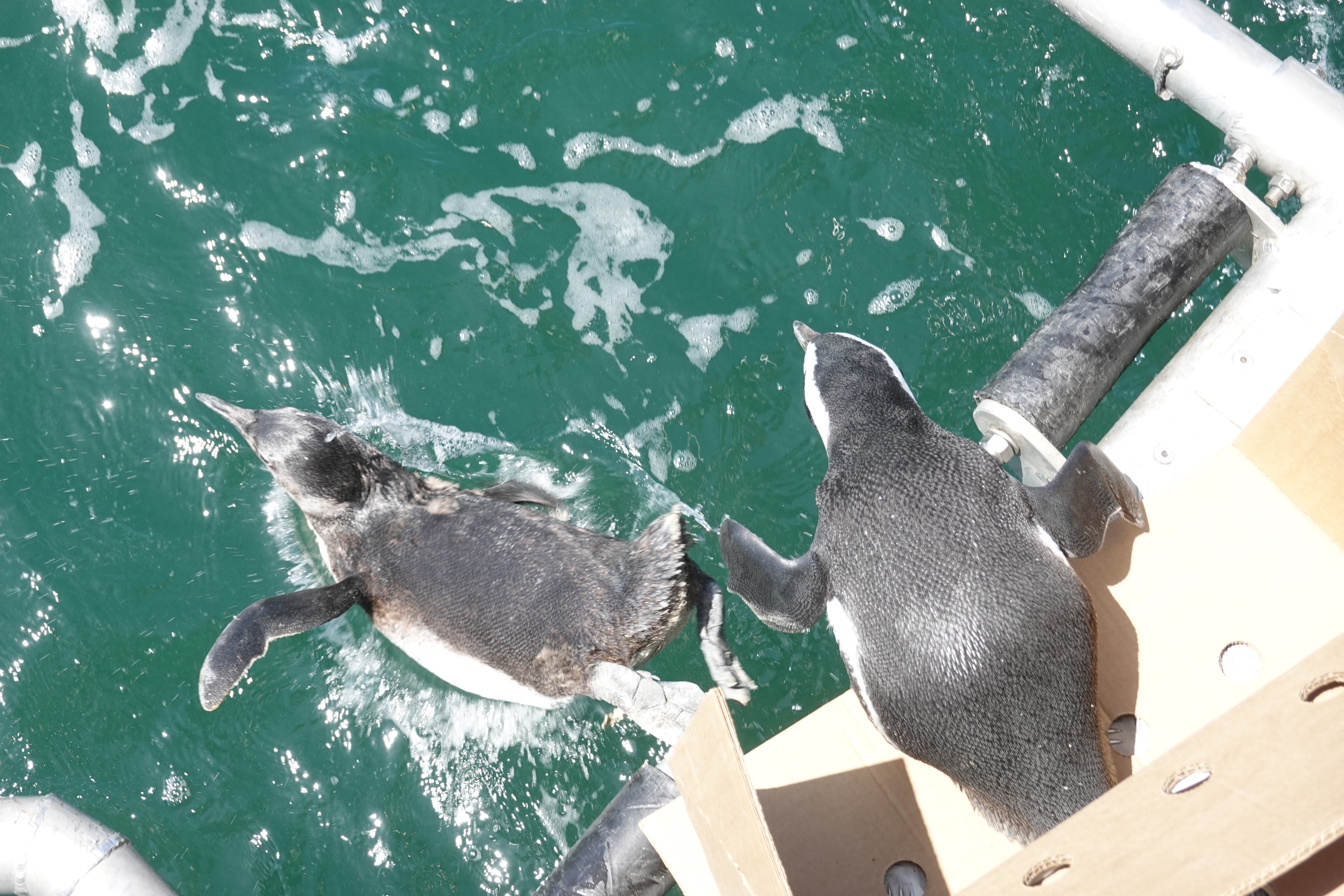 The highlight of our trip was that our boat was used by a conservation team to release nine injured penguins back into the wild to rejoin their colony. The penguins had been hurt in attacks by seals and sharks before being rescued and rehabilitated. The penguin population has been much depleted by human intervention, for example their nesting material has been harvested for use as fertiliser. Local charities are now providing nesting boxes.
