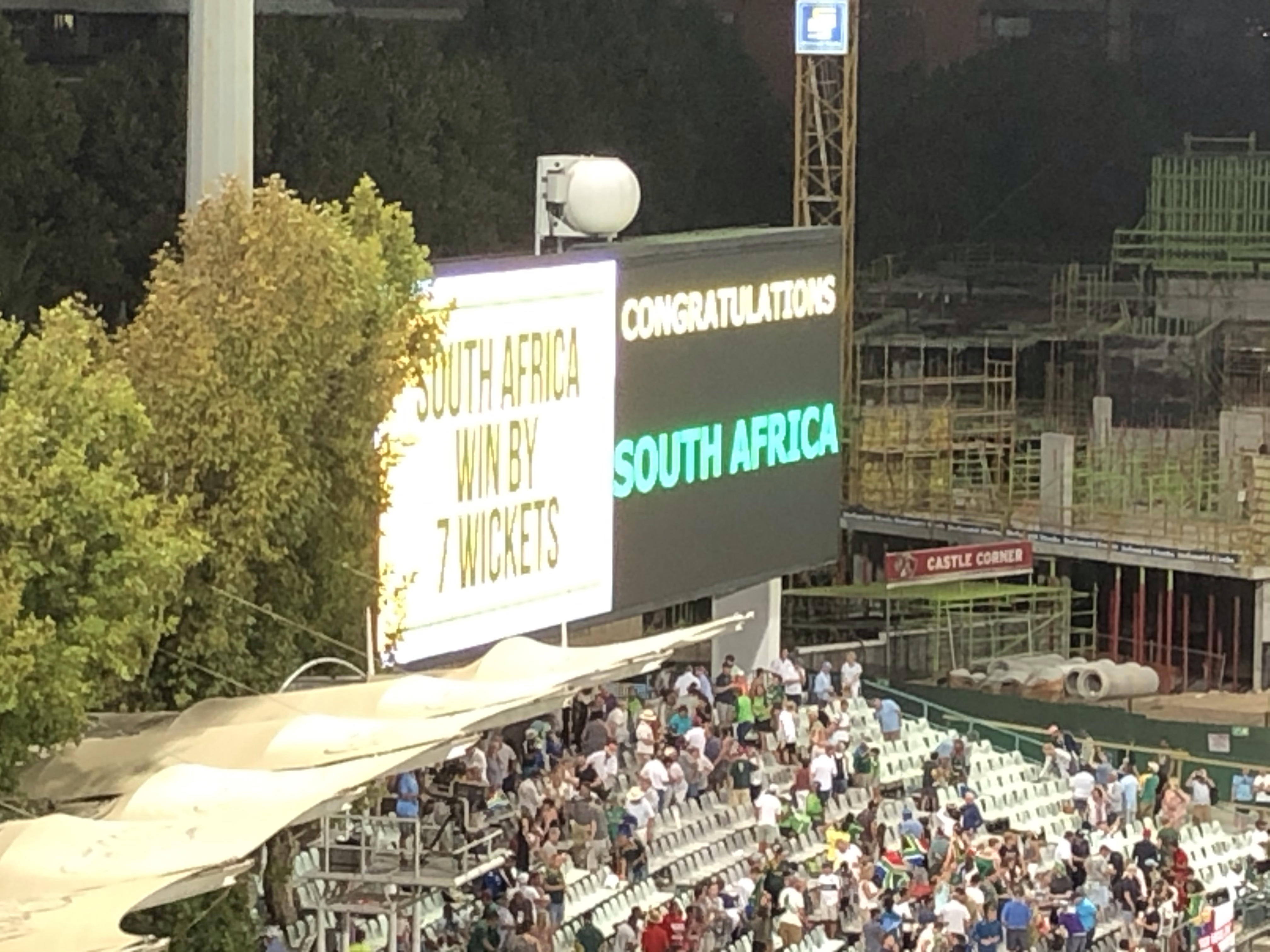 For periods on both days the scoreboards and tannoy system were out of action due to “load shedding” – a system whereby different districts lose electricity in rotation for a couple of hours each to protect the grid. The England supporters attempted to keep score either in their heads or on scraps of paper, however for some even keeping track of the wickets was a challenge after a few beers. England won the first match and sort of lost the second match. Roy scored a century on day one and Bairstow the same on day two, however Tim is sure he retired on 99 !