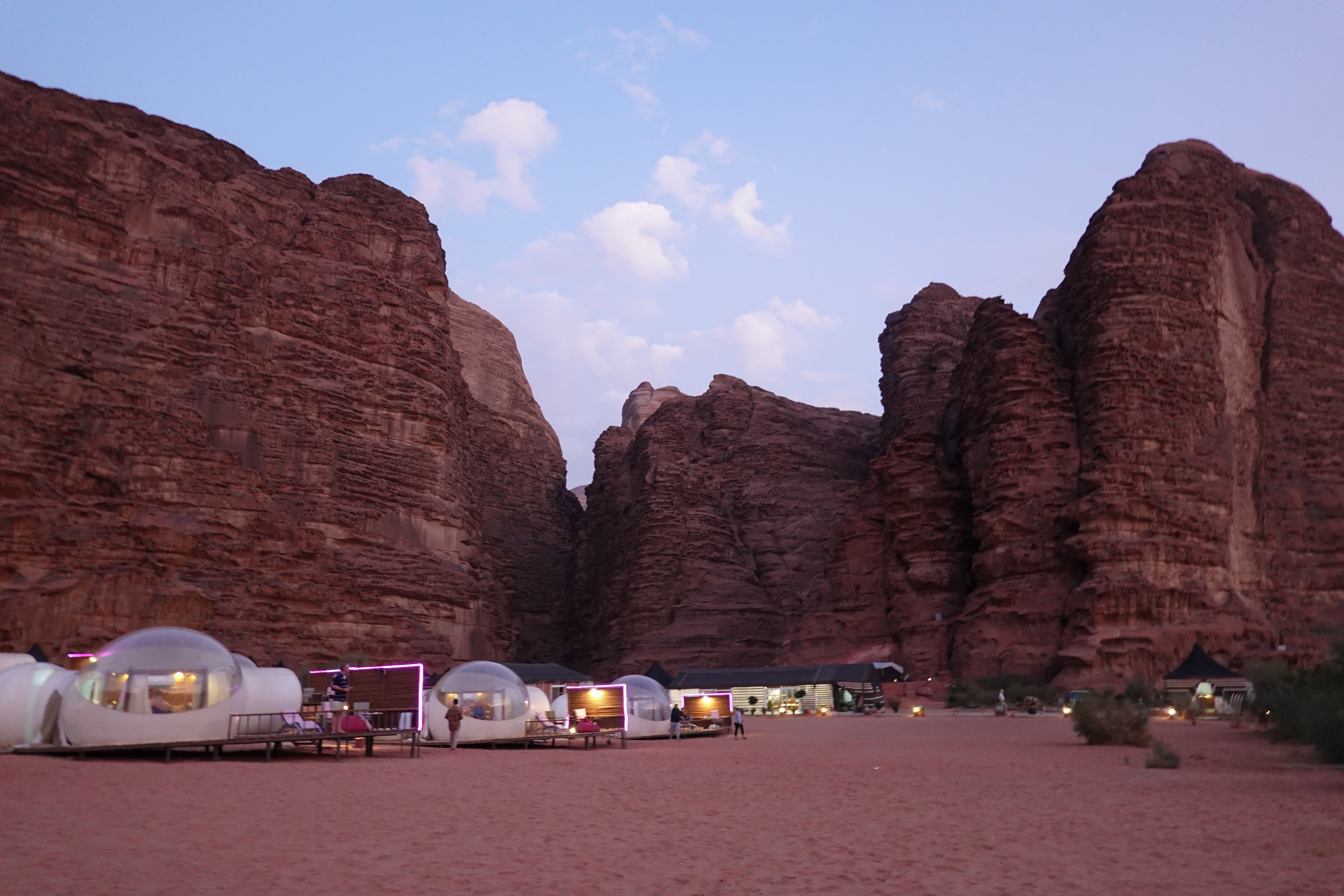 We had a night of “glamping” in an igloo shaped tent with a transparent side and roof enabling star gazing from bed. We experienced a 4 wheel drive tour on the back of an aged Toyota, visiting a desert spring, a canyon, a rock bridge and a sand dune; finishing with Bedouin tea made on an open fire. However the scenery was the star attraction !