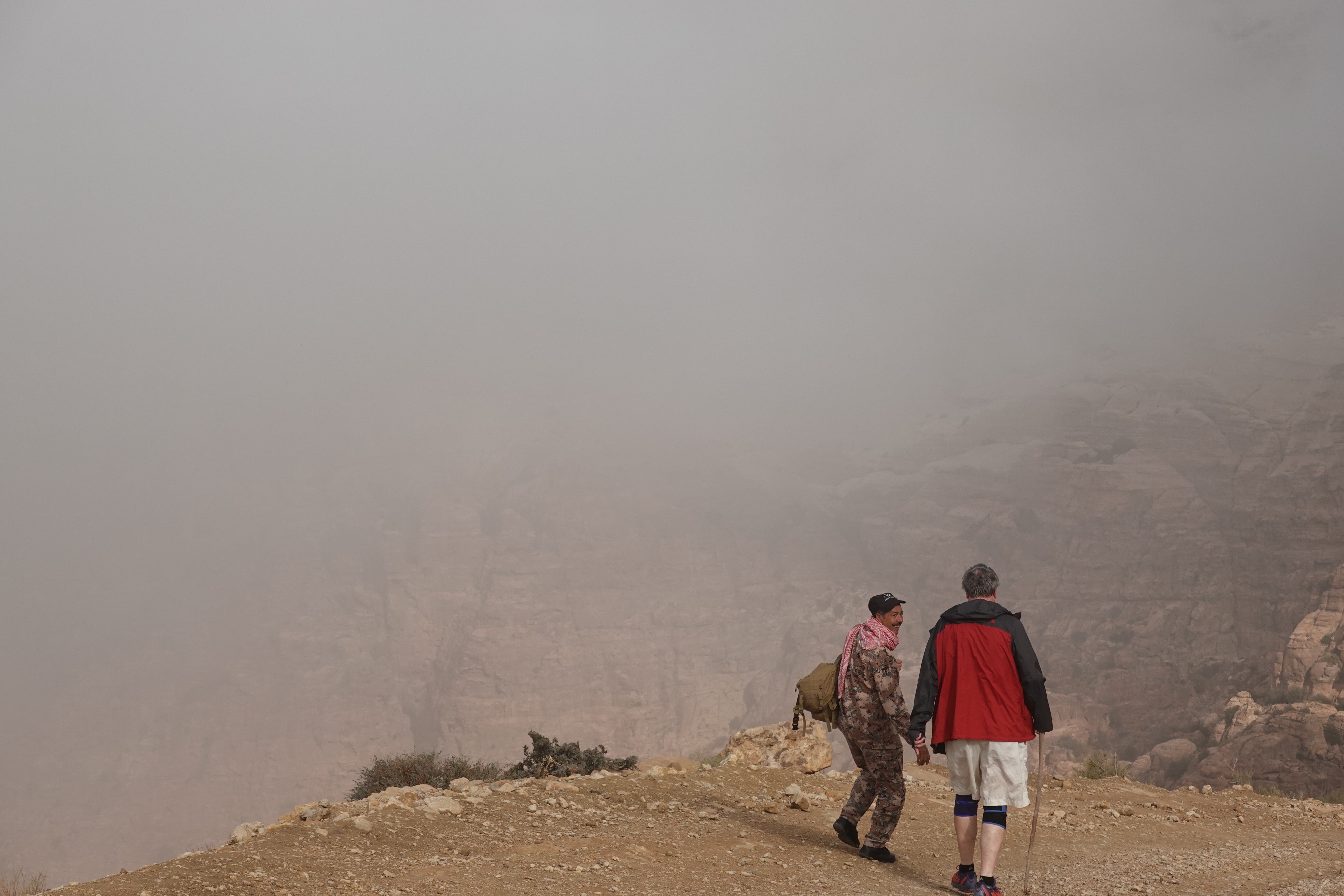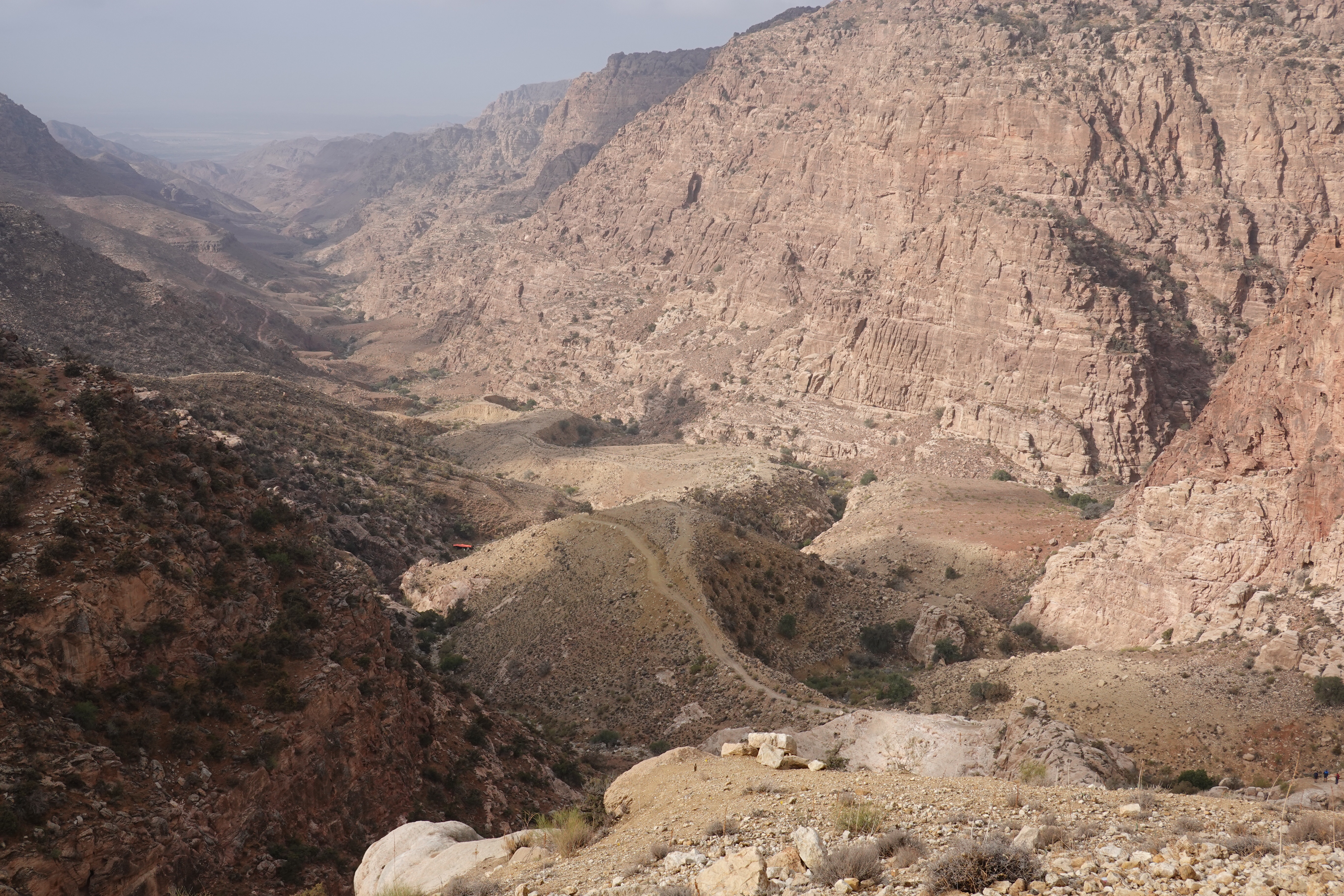 After a night in a guesthouse, our bags were collected and we began the hike to our next stop at Feynan. We had woken to a thick blanket of mountain cloud. As we set off this cleared to reveal the track ahead of us – 16km through the Wadi, starting at 1,250m and ending at 375m. The steepest section is the first 2km – our legs will remember it for some time. A local guide provided “trekking poles” made from broken off branches and brewed Bedouin tea with our lunch.