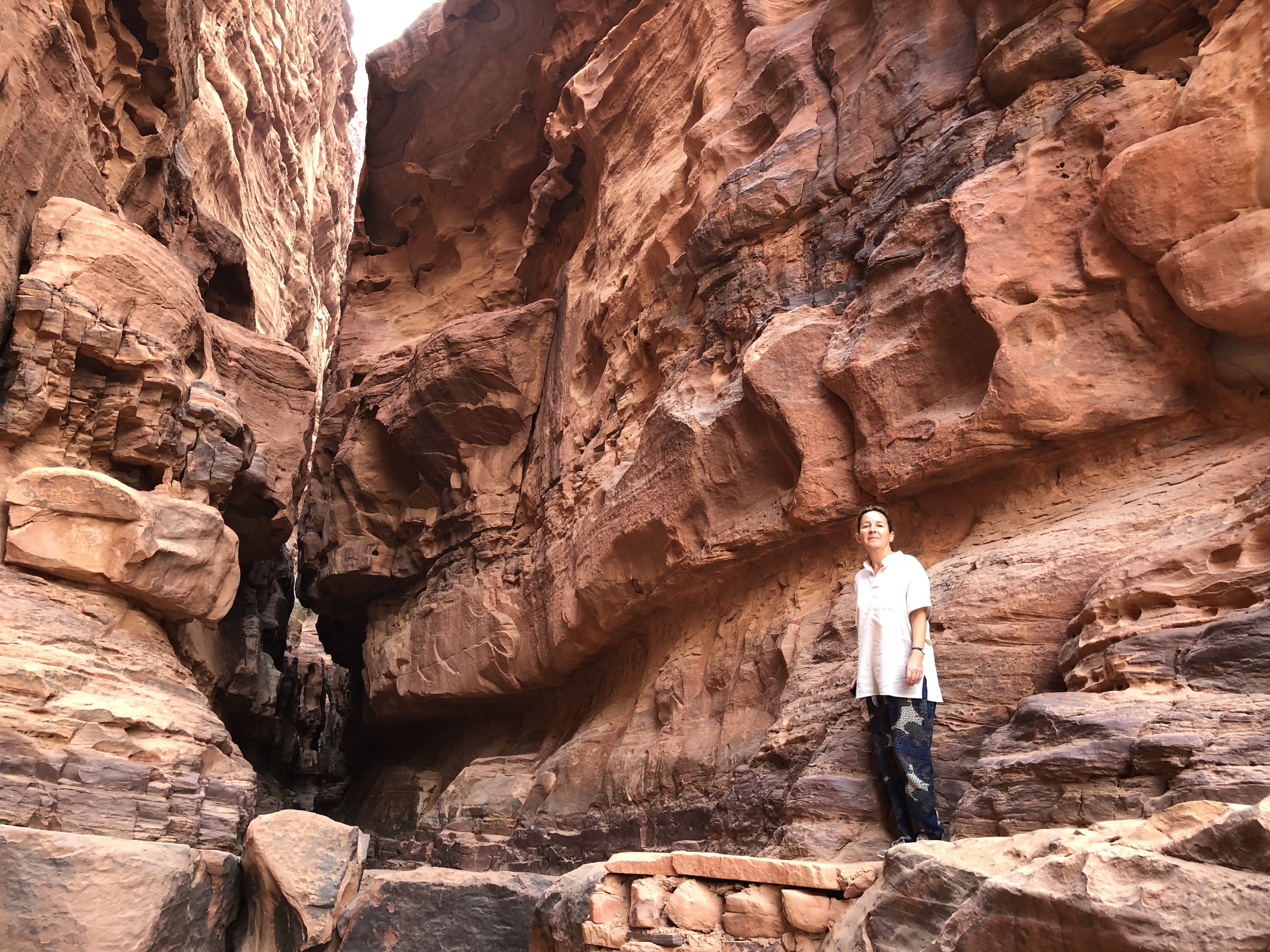 At the end of our trail we reached Feynan Eco Lodge, built in 2005 with the aim of generating income for local Bedouins, protecting nature and supporting ecology. Everything is locally sourced and all the staff are local; hot water and a very limited electricity supply are solar generated. The bedrooms have a single electric light in the bathroom, all other lighting throughout the lodge being provided by candles. With very limited WiFi and one recharging point in reception, this was two nights to go screen free. It was also alcohol free and vegetarian. During our stay the sun set at 4.45pm and supper was at 6pm with stargazing on the roof terrace at 8pm. It is surprising how quickly your body clock adjusts to the absence of artificial light. The food was delicious and the staff very welcoming and informative, leading walks in the local area. Because of the condition of the 8km track to the lodge, on departure we were taken to a vehicle meeting point by a Bedouin in his “seen better days” pick up truck.